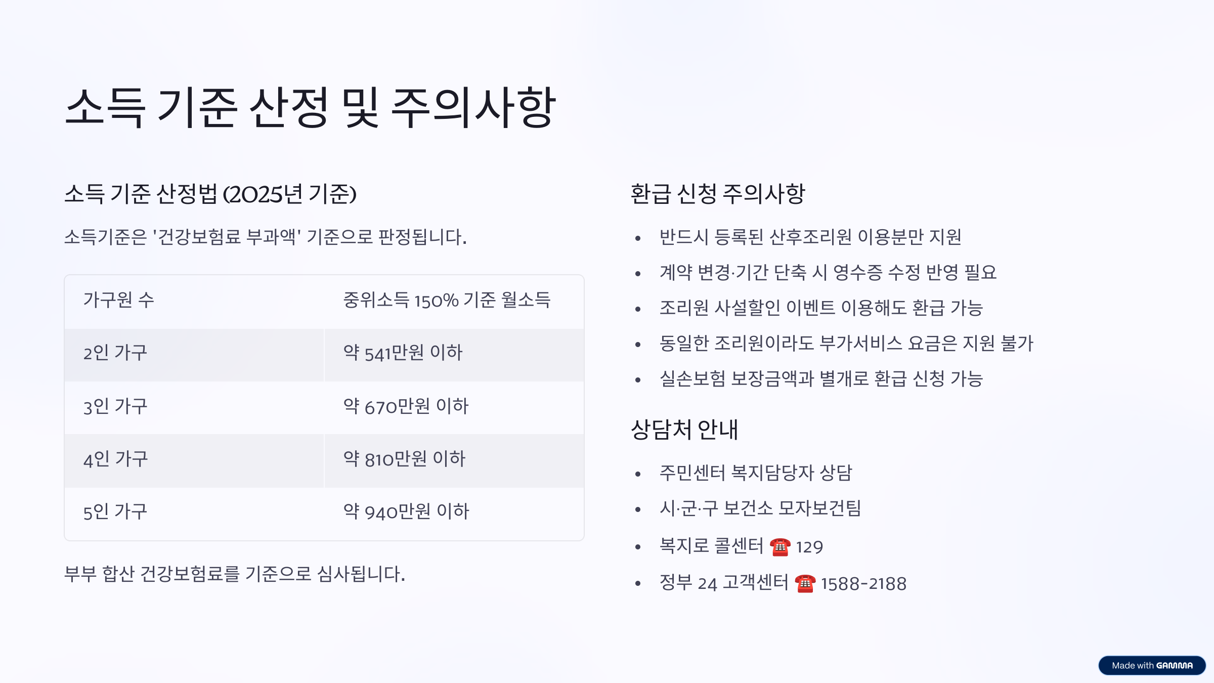 - 기초생활수급자·차상위계층·한부모가정·장애인 산모는 별도 확대지원
