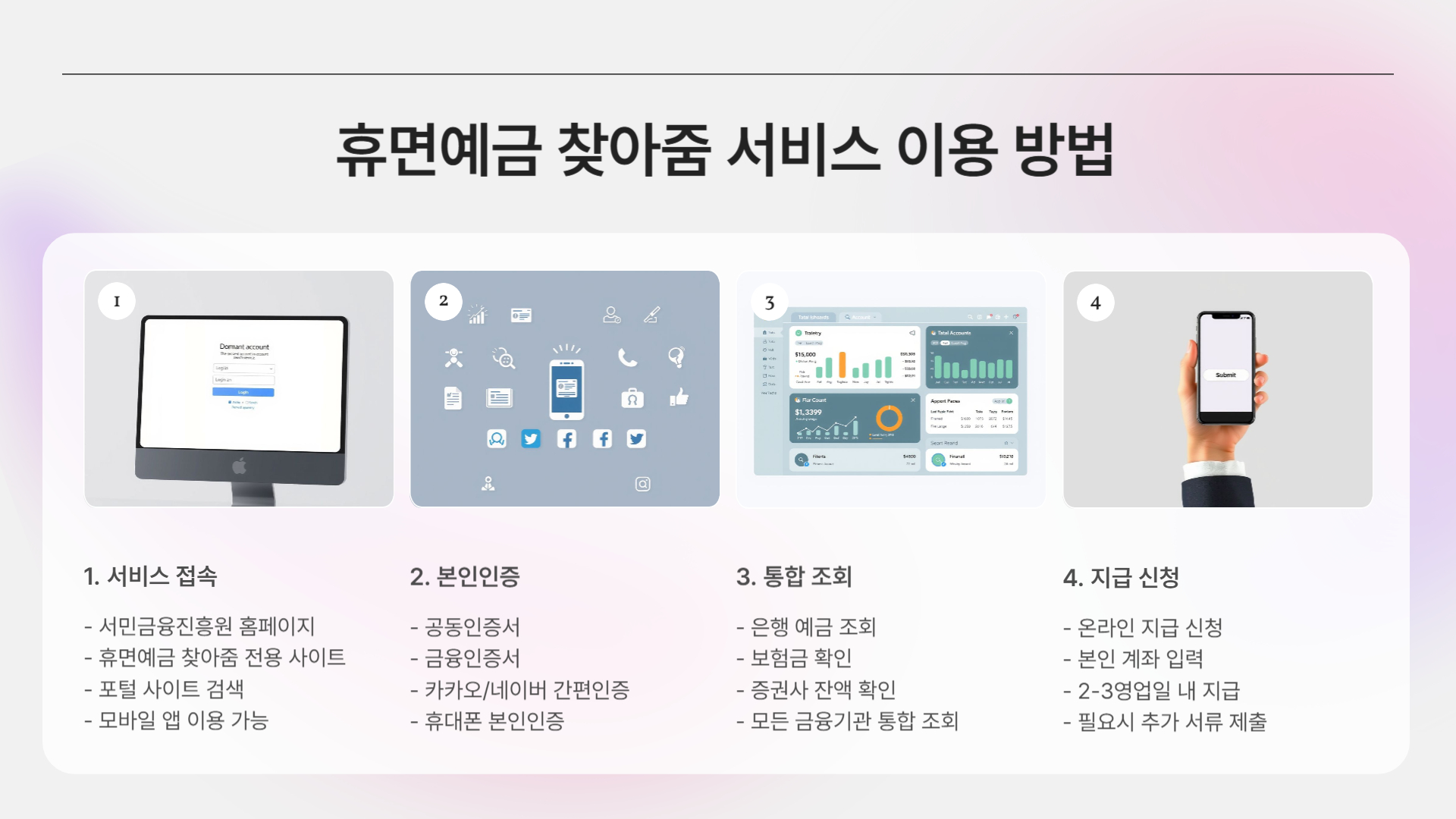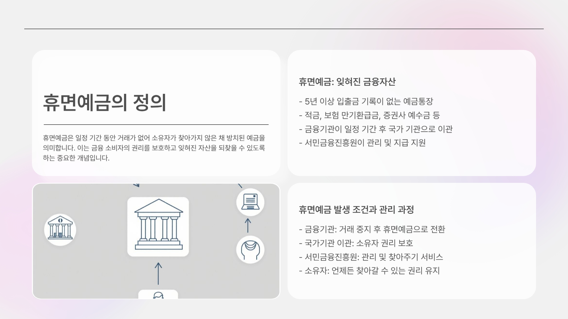 혹시 잊고 있던 통장이나 보험금이 있는지 궁금해 보신 적 있으신가요? 바쁜 일상 속에서 이사, 직장 이동, 통장 정리 등을 하다 보면 자신도 모르게 찾아가지 못한 예금이 남아 있을 수 있습니다. 이렇게 오랫동안 주인이 찾지 않아 남아 있는 금융자산을 바로 휴면예금이라고 부릅니다. 이 휴면예금을 안전하고 간편하게 찾을 수 있도록 도와주는 것이 바로 서민금융진흥원 휴면예금 찾아줌 서비스입니다.