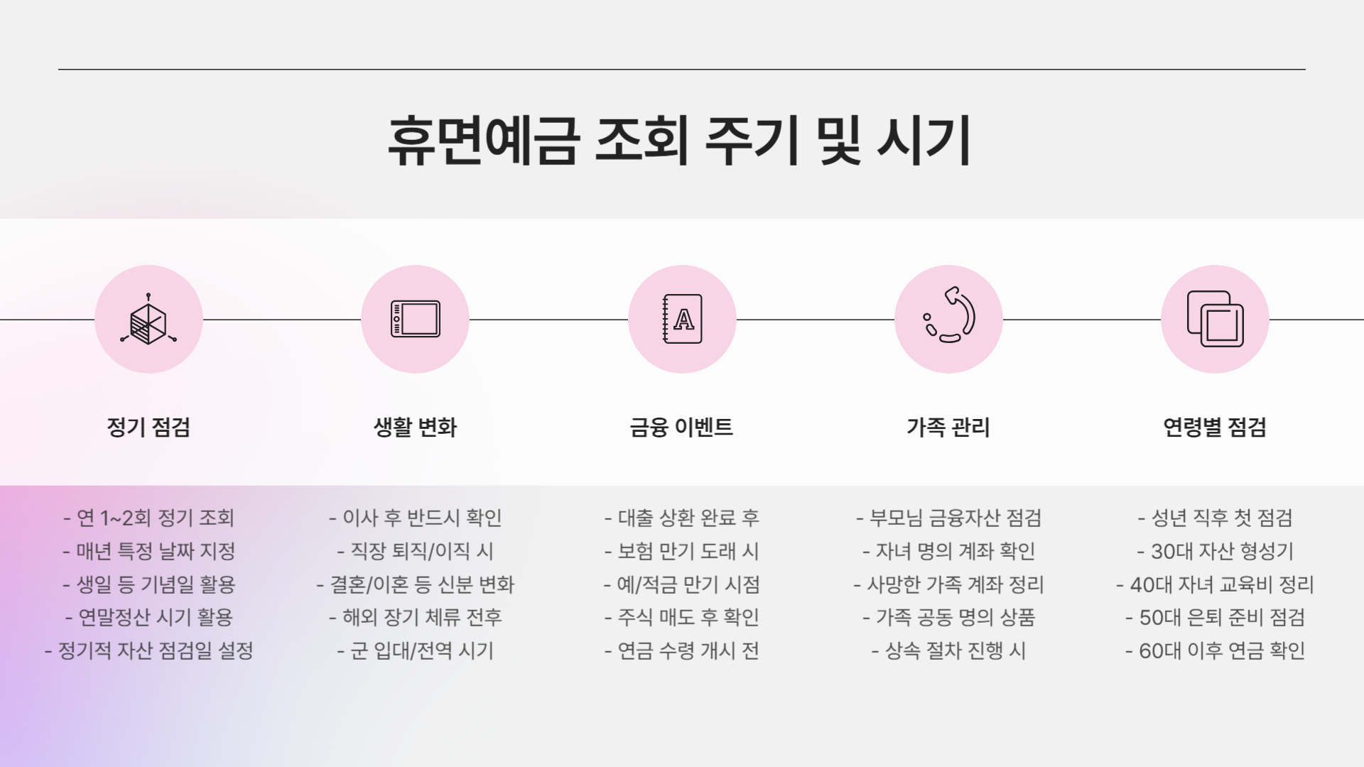 휴면예금 조회는 특별히 제한 없이 수시로 이용할 수 있습니다. 하지만 최소 1년에 1~2회 정도 주기적인 점검을 권장드립니다. 특히 다음과 같은 경우에는 반드시 한 번 확인해 보는 것이 좋습니다.