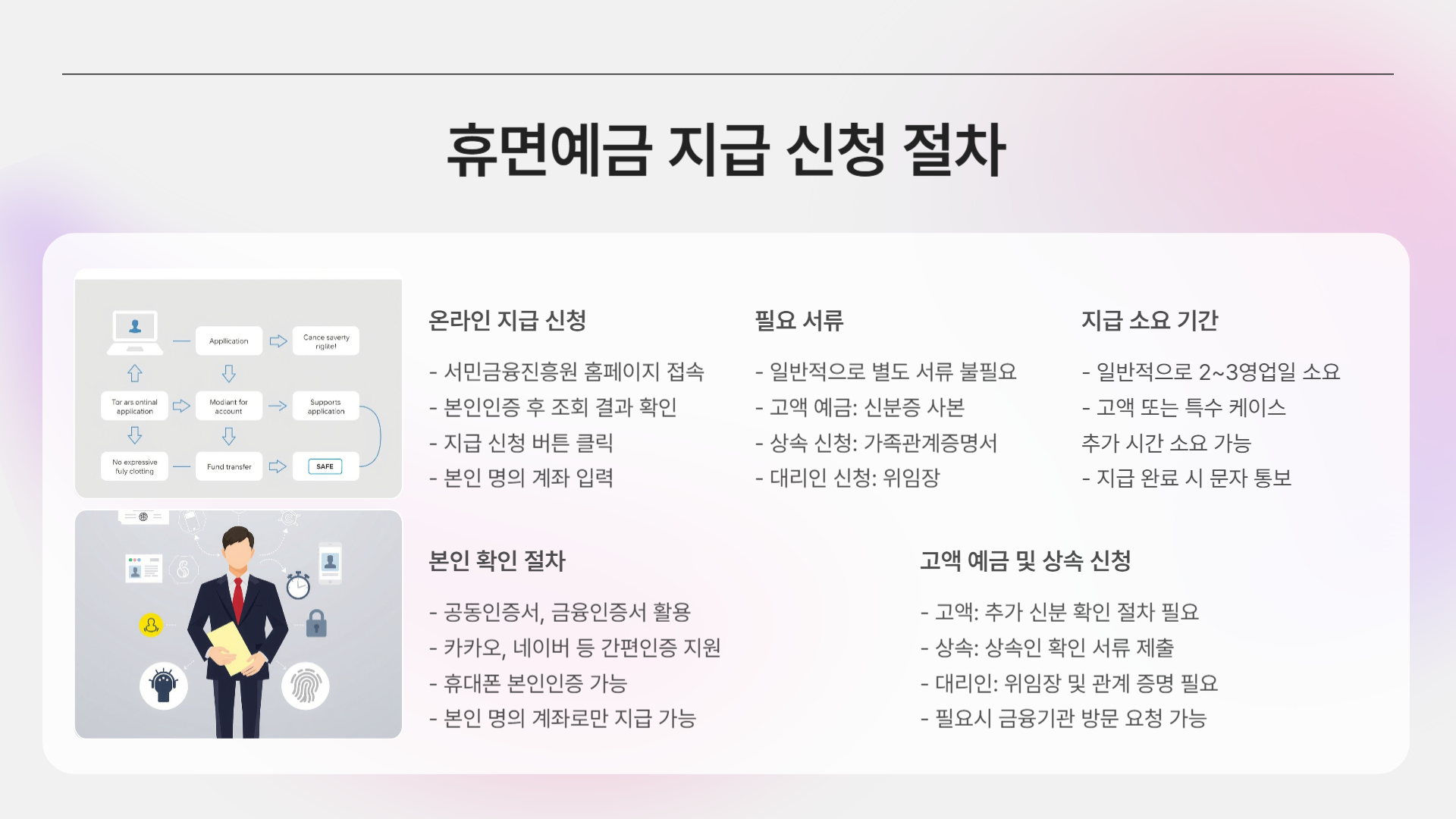 휴면예금 조회 후 해당 금액이 확인되면 바로 온라인 지급 신청을 진행할 수 있습니다. 지급 신청 시 별도의 복잡한 서류 제출은 필요하지 않으며, 본인 명의의 계좌를 입력하면 대부분 2~3 영업일 이내에 지급이 완료됩니다. 단, 고액 예금이나 상속이 필요한 경우에는 신분증 사본, 가족관계증명서 등 추가서류가 요구될 수 있으므로 안내사항을 꼼꼼히 확인하는 것이 좋습니다.