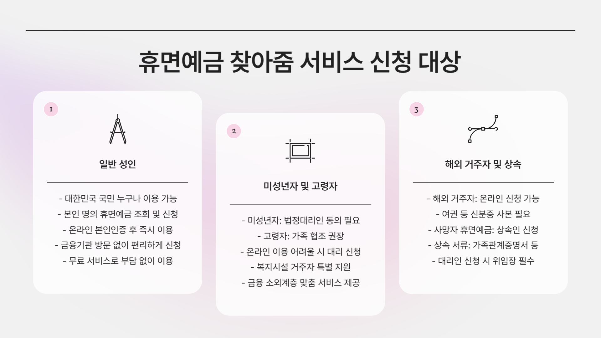 서민금융진흥원 휴면예금 찾아줌 서비스는 대한민국 국민이라면 누구나 이용 가능합니다. 성인은 물론 미성년자, 고령자, 해외거주자 등도 조회가 가능합니다. 또한 이미 사망한 가족의 휴면예금도 상속권자가 필요한 서류를 준비해 신청하면 찾을 수 있습니다. 실제로 부모님, 조부모님 이름으로 남아 있는 휴면예금이 발견되는 경우가 자주 있으므로 가족 구성원이 함께 확인해 보는 것도 적극 추천드립니다.