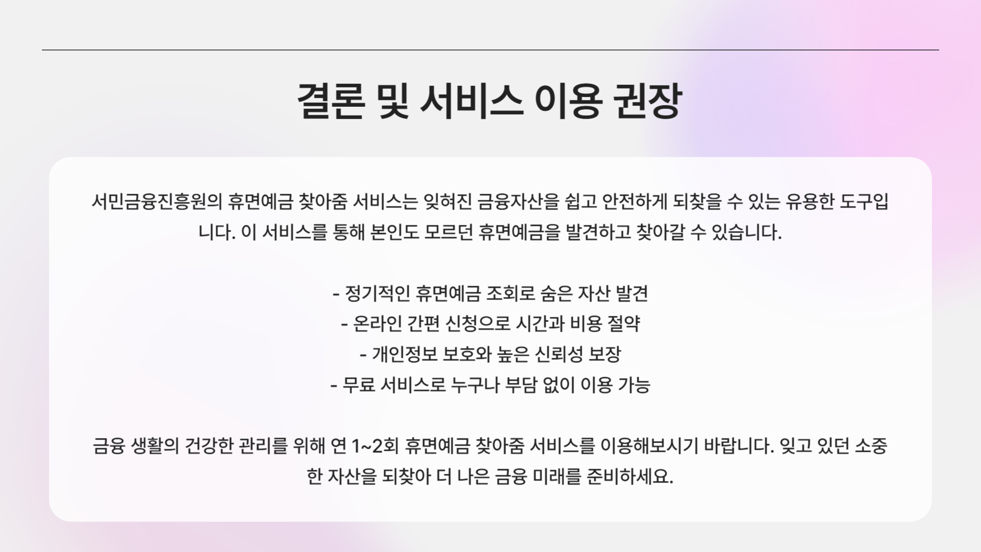 서민금융진흥원 휴면예금 찾아줌 서비스는 생각보다 많은 분들이 찾아내지 못한 숨은 돈을 되찾을 수 있는 좋은 제도입니다. 소중한 나의 금융자산을 놓치지 않고 챙기기 위해서 정기적인 휴면예금 조회는 필수입니다. 간단한 본인인증만으로 빠르고 쉽게 조회할 수 있으니, 이번 기회에 한 번 확인해 보시길 추천드립니다.