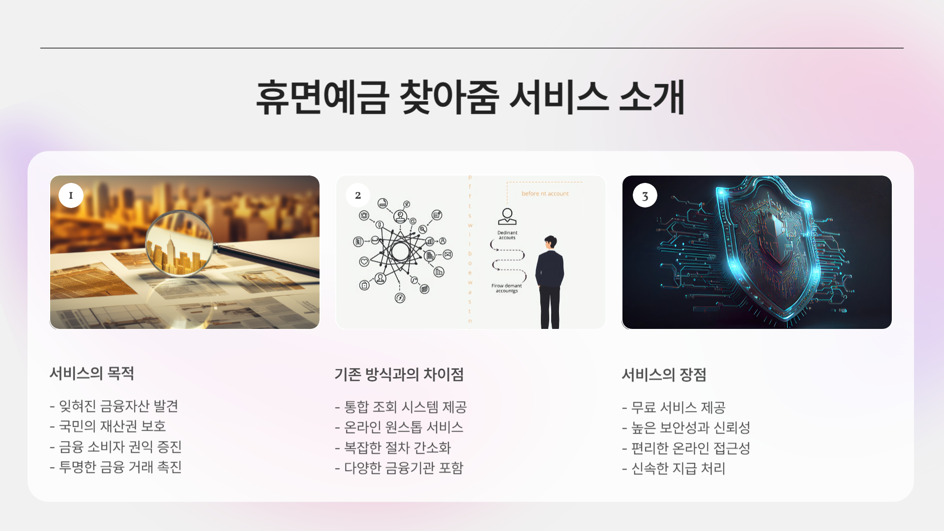 기존에는 본인의 휴면예금을 찾기 위해 여러 금융기관을 각각 방문하거나 고객센터를 일일이 문의해야 하는 불편함이 있었습니다. 하지만 서민금융진흥원 휴면예금 찾아줌 서비스를 이용하면 한 번의 조회로 모든 금융기관의 휴면예금을 간편하게 확인할 수 있습니다. 이 서비스는 정부기관에서 운영하기 때문에 개인정보 보호와 신뢰성 면에서도 안심하고 이용할 수 있습니다. 무엇보다 무료로 제공되기 때문에 누구나 쉽게 사용할 수 있습니다.