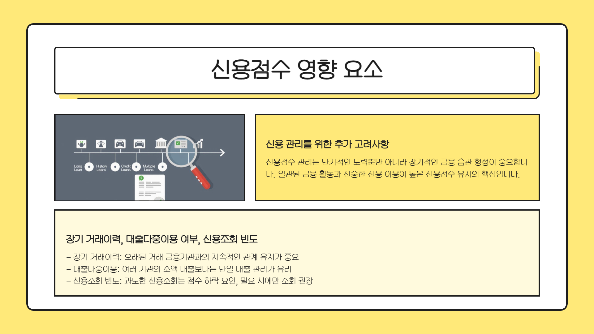 - 과도한 신규 대출 시 신용점수 하락 요인