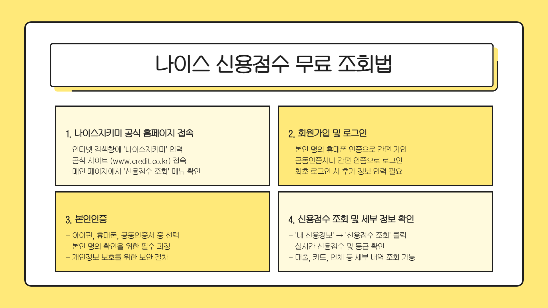 나이스 신용점수 조회법은 아주 간편하게 무료로 확인할 수 있습니다.