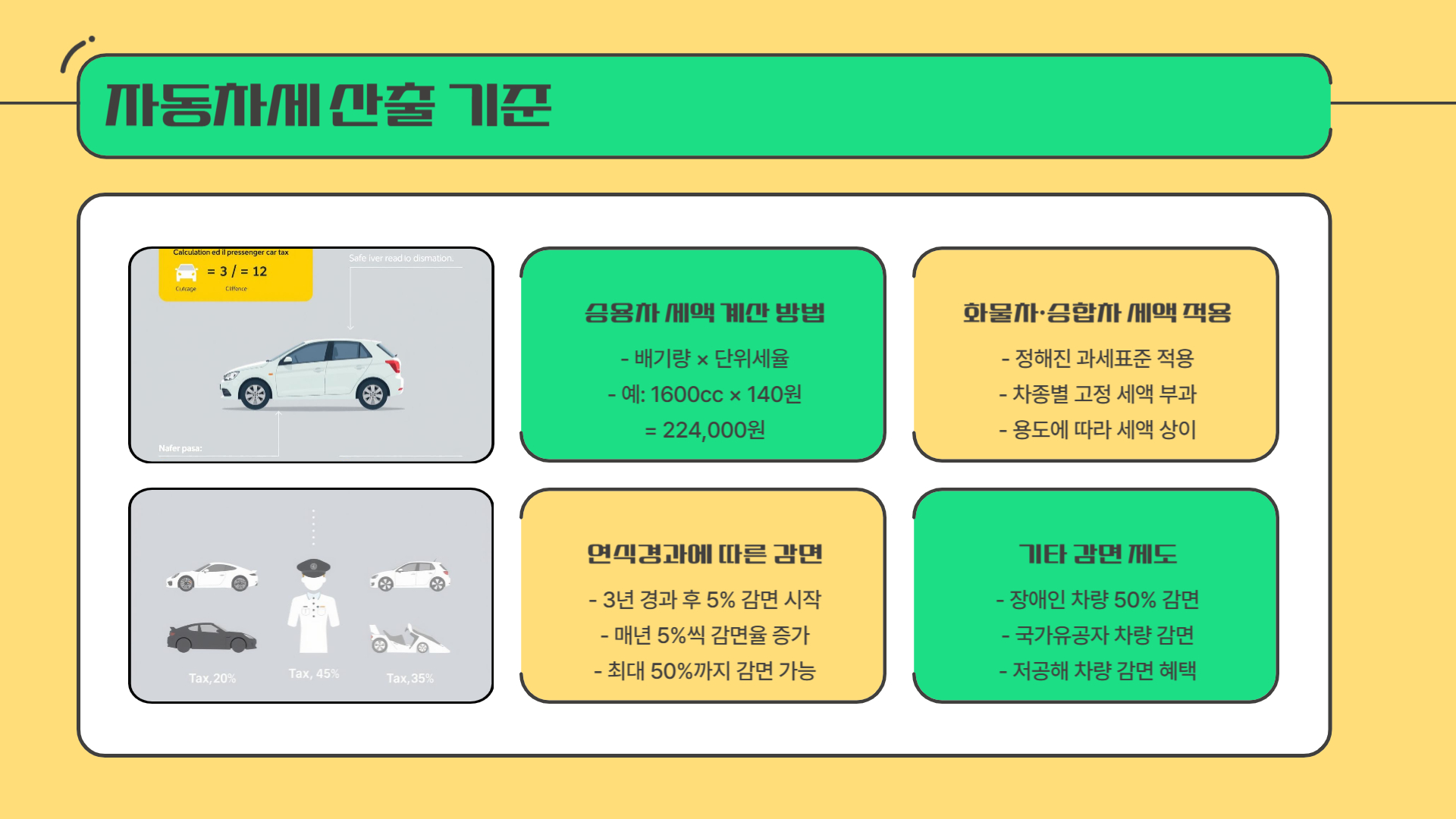 - 배기량 × 단위세율 적용 (예: 1600cc 차량 → 1600 ×140원 = 224,000원)