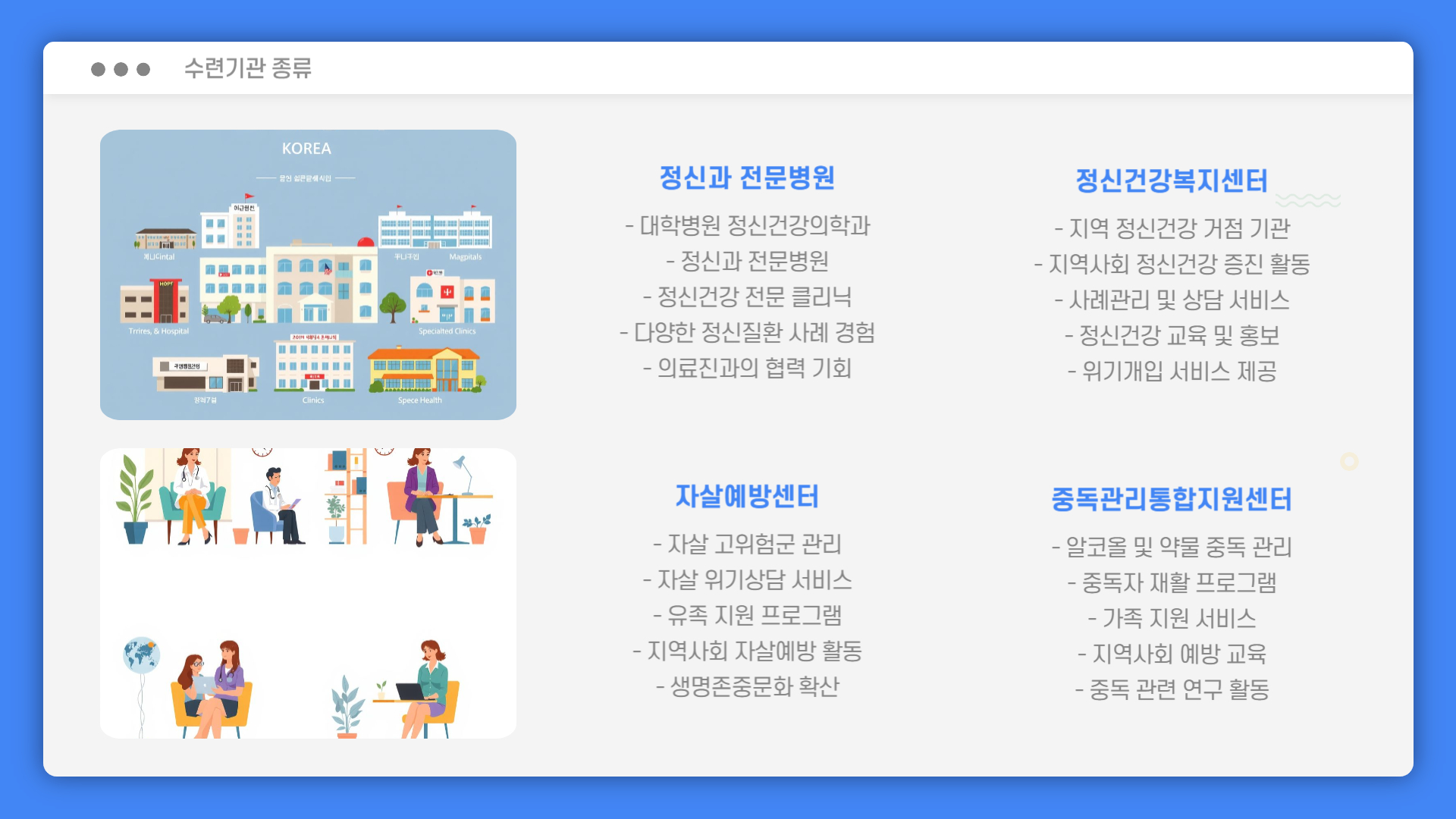 • 수련기관: 정신과 병원, 정신건강복지센터, 중독관리센터 등