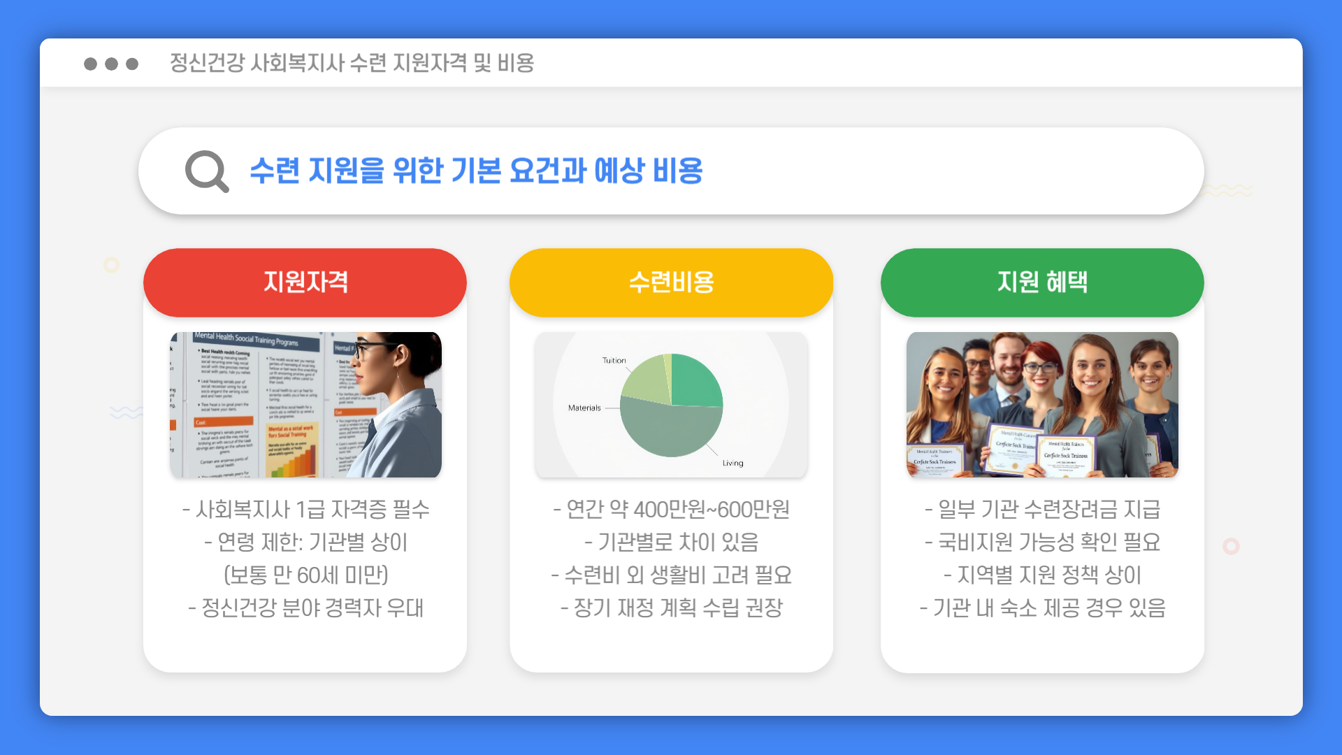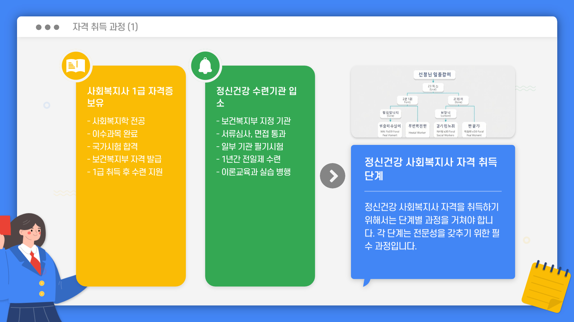 정신건강 사회복지사가 되기 위해 필요한 자격조건부터 수련기관 입소, 수련 내용, 자격증 발급까지 전 과정을 자세히 안내해 드리겠습니다.