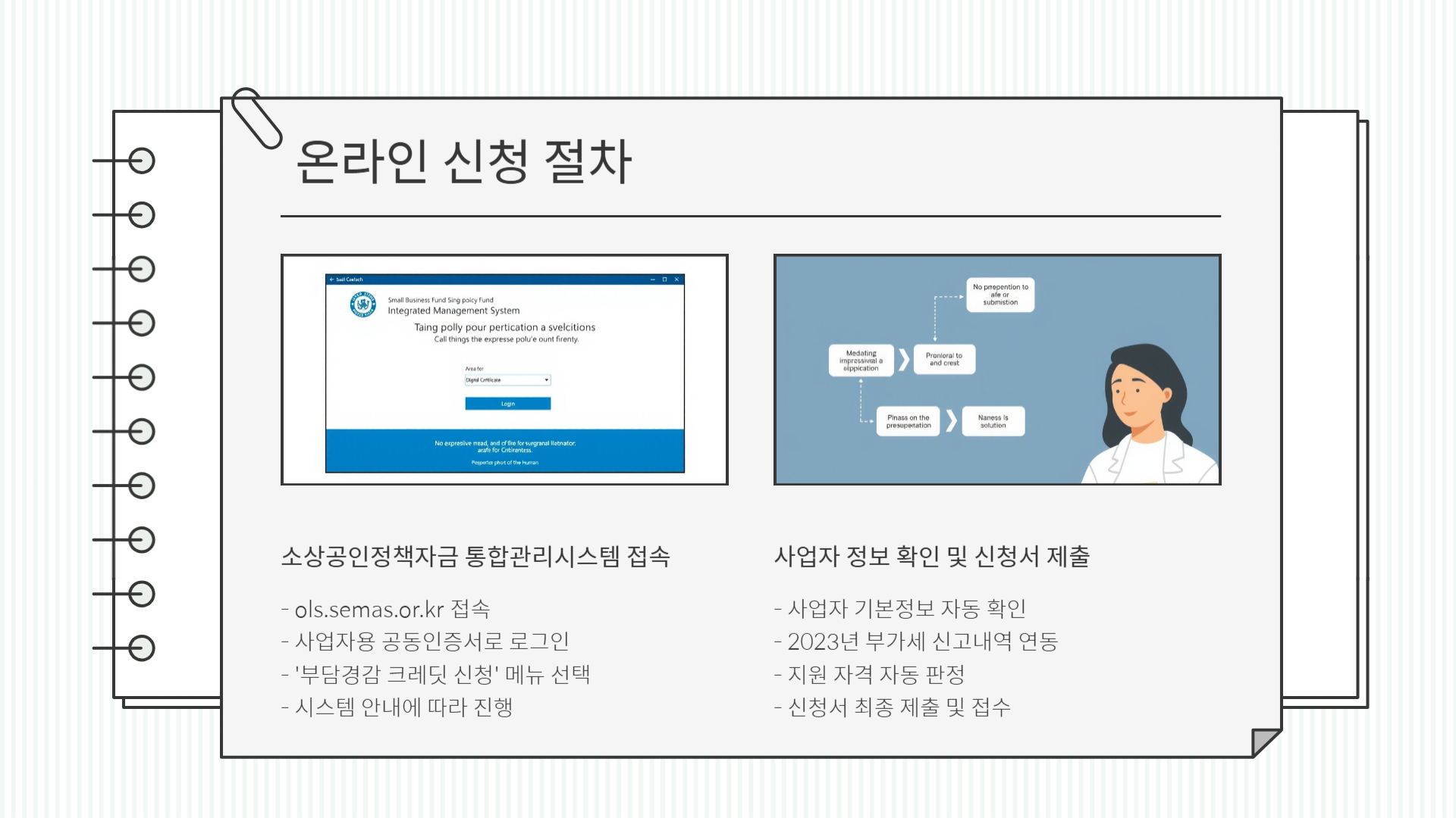 특히 사업자용 공동인증서는 온라인 신청에 반드시 필요하므로 미리 준비하는 것이 좋습니다. 2023년도 부가세 신고를 완료했는지도 반드시 확인하시기 바랍니다. 매출 증빙이나 공공요금 납부내역을 사전에 준비하면 신청 속도가 훨씬 빨라집니다.