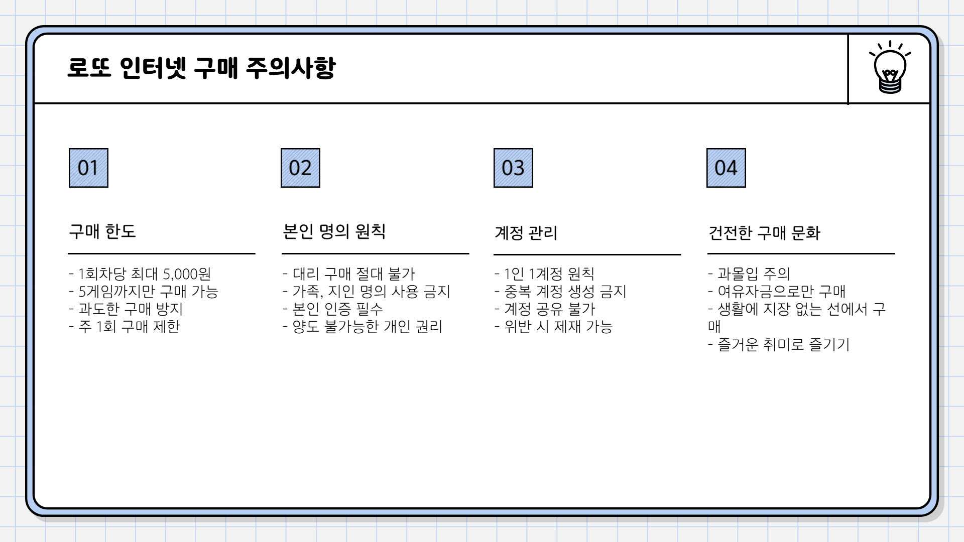 - 복권 구매는 반드시 여유자금으로만 진행 권장
