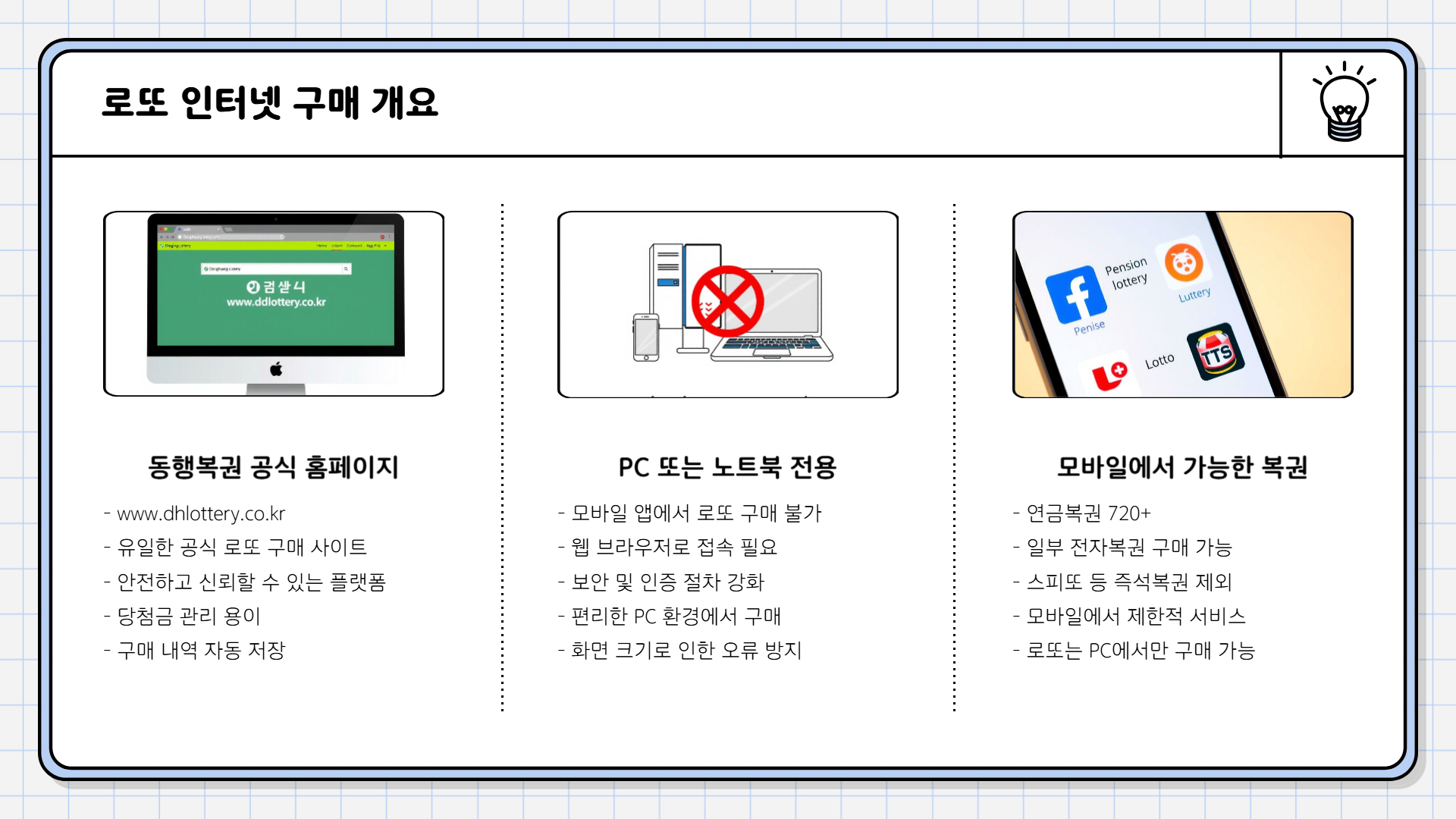 로또 인터넷 구매는 동행복권 공식 홈페이지에서만 가능합니다. 모바일 앱(동행복권 앱)에서는 로또 구매가 불가능하며, PC 또는 노트북을 통한 웹 접속으로만 구매가 가능합니다.
