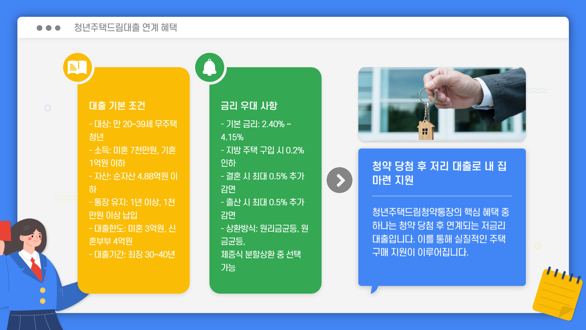 이 통장의 진짜 핵심은 대출 연계입니다. 청약에 당첨된 후에는 정부 저리 대출을 통해 내 집 마련 부담을 크게 줄일 수 있습니다.