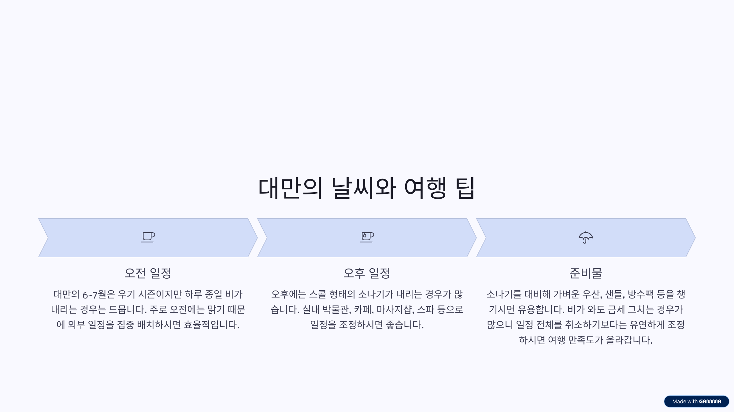비가 와도 금세 그치는 경우가 많으니 일정 전체를 취소하기보다는 유연하게 조정하시면 여행 만족도가 올라갑니다.