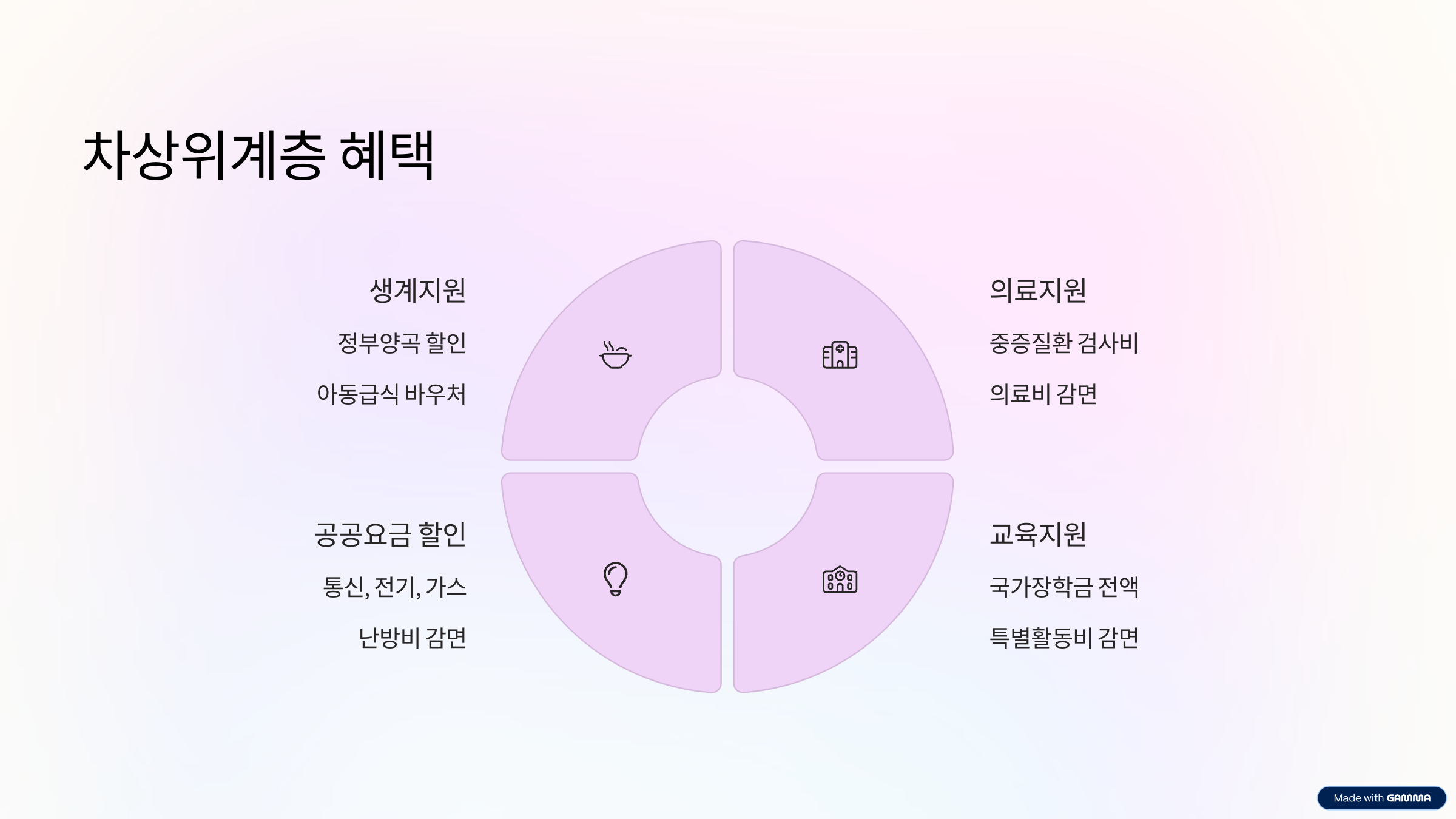 즉, 차상위계층은 수급자는 아니지만 여전히 경제적 어려움이 상당한 가구를 위한 제도라고 보시면 됩니다. 그리고 차상위계층으로 지정되면 각종 복지 혜택이 추가로 제공됩니다.
