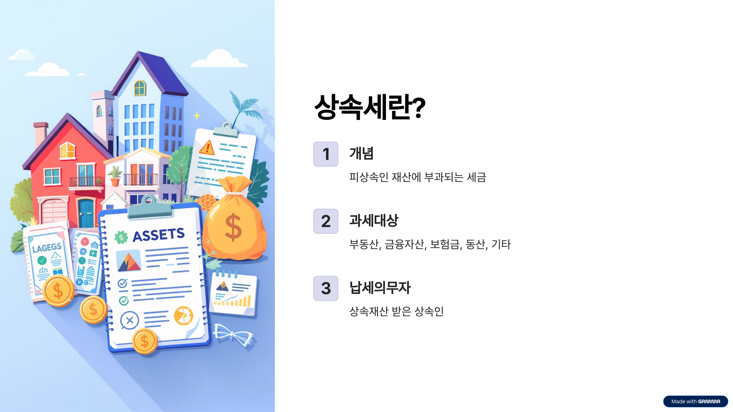상속세란 피상속인(사망한 분)이 남긴 재산을 상속받는 사람이 내야 하는 세금입니다. 상속세는 모든 재산에 부과되는 것이 아니라, 일정 기준 금액(공제한도)을 넘는 금액에만 과세가 이루어집니다.