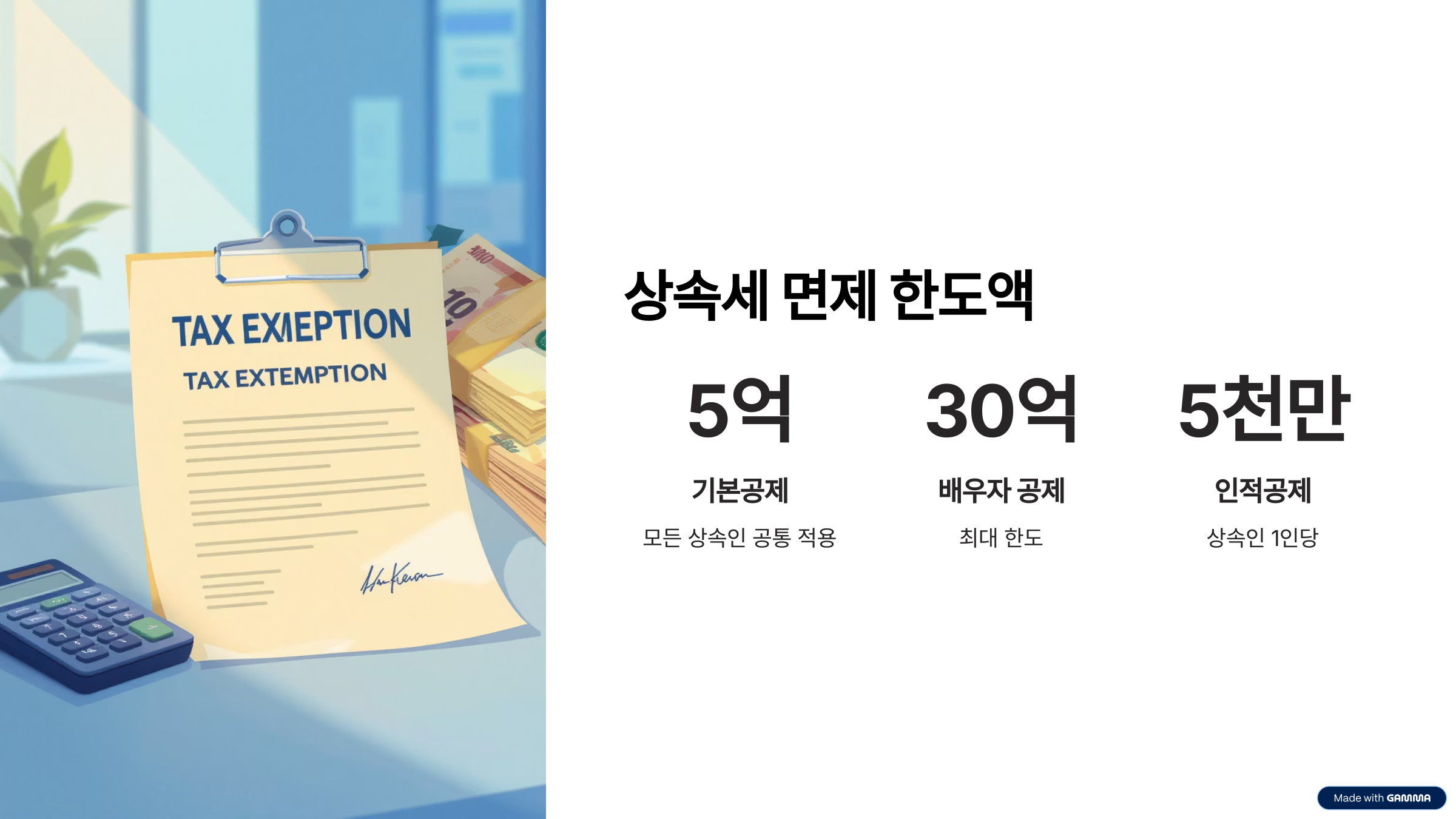 상속세는 모든 재산에 부과되지 않고 일정 금액까지는 공제되며, 이 한도가 바로 '면제 한도액'입니다.