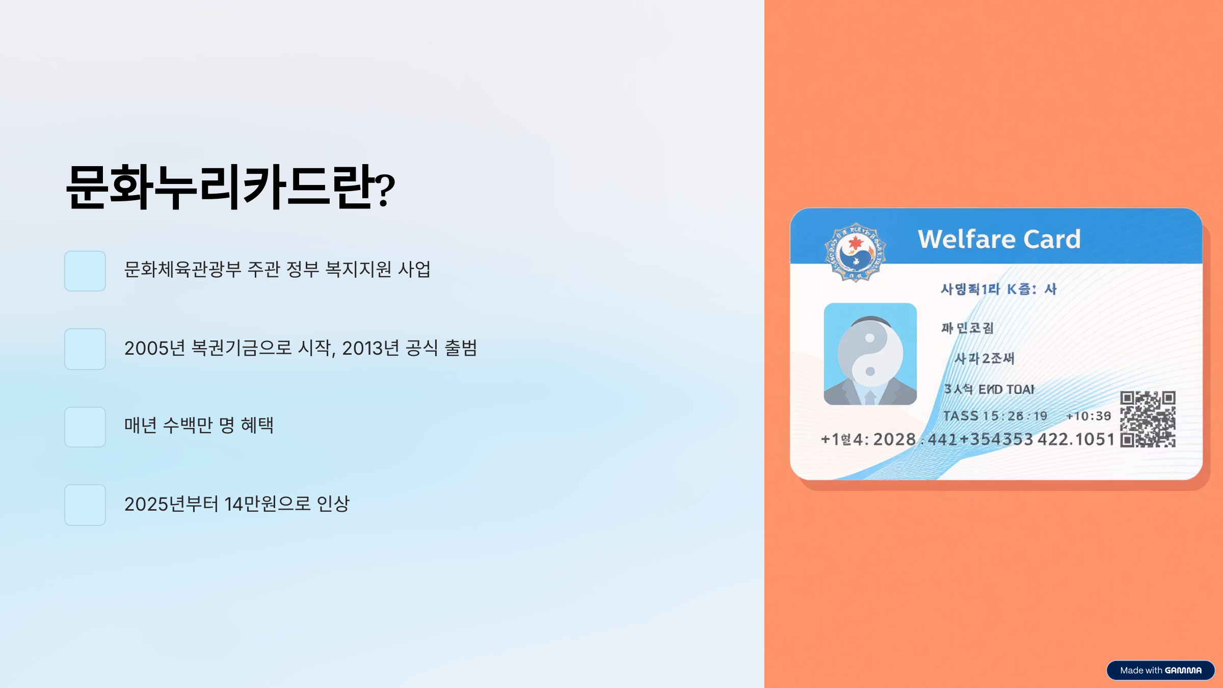 먼저 문화누리카드는 단순한 할인카드가 아니라 문화체육관광부가 주관하는 정부 복지지원 사업입니다. 기초생활수급자와 차상위계층이 경제적 부담 없이 문화예술, 국내여행, 체육활동 등을 누릴 수 있도록 연간 일정 금액을 지원하는 정책입니다. 2005년 복권기금으로 시작해 2013년에 문화누리카드라는 이름으로 본격 시행되었는데요, 현재는 전국적으로 매년 수백만 명이 이 혜택을 받고 있을 정도로 정착된 복지카드입니다.