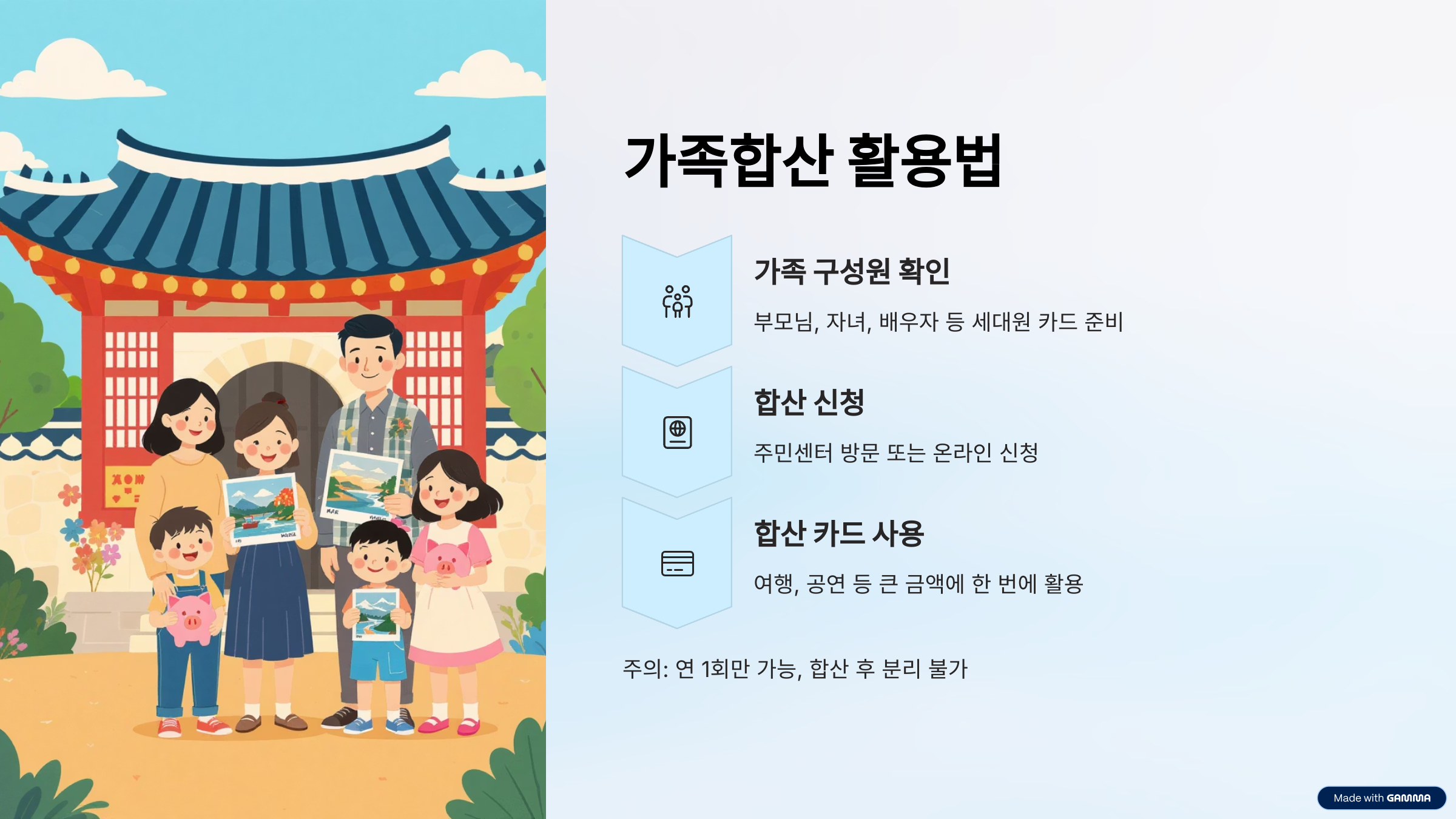 단, 주의사항이 있습니다. 합산은 연 1회만 가능하고, 합산 이후에는 다시 분리할 수 없으니 신중하게 결정하셔야 합니다. 또한 본인이 직접 충전한 금액은 합산 대상에서 제외됩니다.