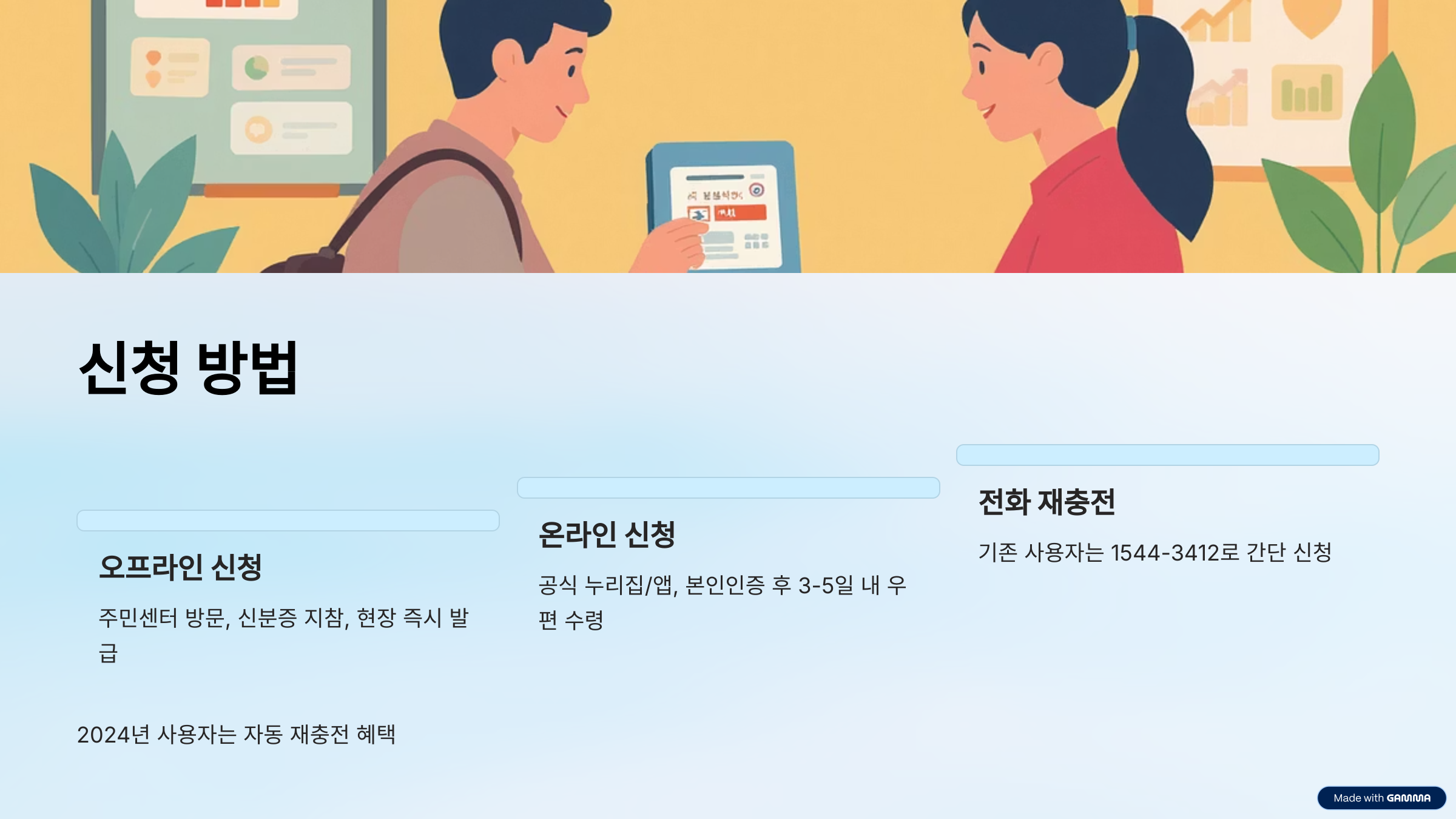 이미 이전에 발급받아 사용한 이력이 있고 2025년에도 자격이 유지되는 분들은 **전화(1544-3412)**로 간단히 재충전 신청만 하면 됩니다. 심지어 2024년에 1회라도 사용한 기록이 있다면 자동으로 14만 원이 충전되는 자동 재충전 시스템도 운영되고 있어요. 단, 작년에 카드를 발급받았지만 사용 이력이 전혀 없다면 자동충전 대상에서 제외될 수 있습니다.
