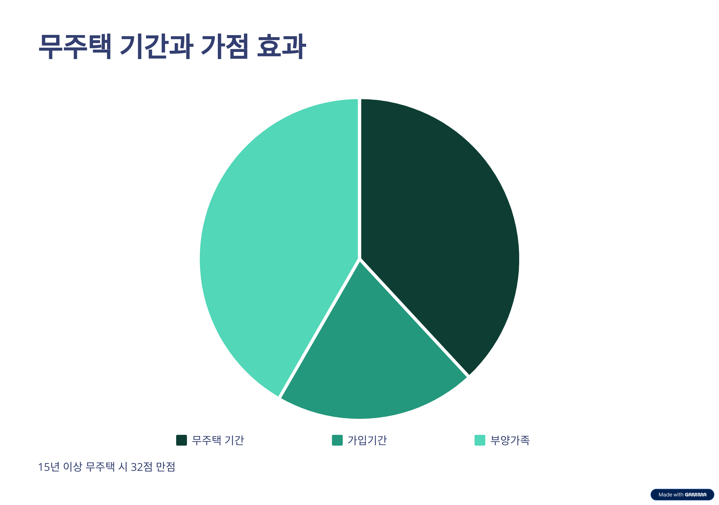 청약 가점은 총 84점 만점이며, 이 중 무주택 기간이 32점으로 가장 높은 비중을 차지합니다. 가입기간을 꾸준히 유지하면서 무주택 세대주 상태를 오래 유지하시면 이 두 요소가 합산되어 상당한 가점을 확보하실 수 있습니다. 특히 15년 이상 무주택이면 무려 32점 만점을 받을 수 있기 때문에 장기 전략이 더욱 빛을 발합니다.