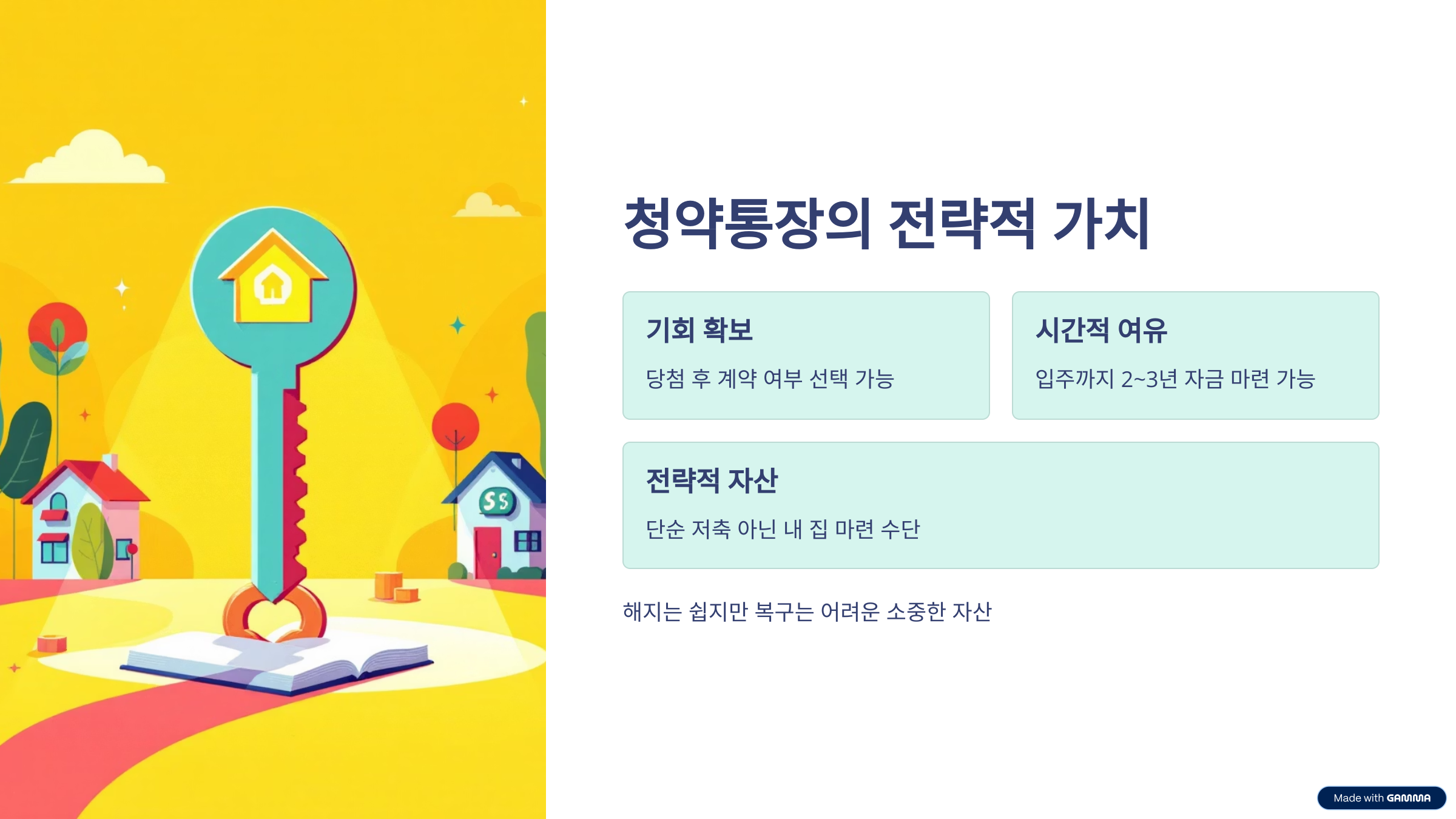 결론적으로 청약통장은 단순히 ‘금리가 낮은 저축통장’이 아니라 장기적 시야로 바라봐야 할 전략적 금융자산입니다. 해지는 언제든 선택할 수 있지만, 한번 해지하면 복구하기 매우 어려운 손실이 발생합니다. 단순히 이자율만 보고 청약통장을 판단하지 마시고, 무주택 가점, 가입기간, 납입 횟수, 소득공제, 부부합산, 담보대출 활용 등 여러 가지 유지 전략을 종합적으로 고려하신다면 청약통장은 여전히 내 집 마련의 가장 강력한 수단 중 하나임을 확인하실 수 있습니다.