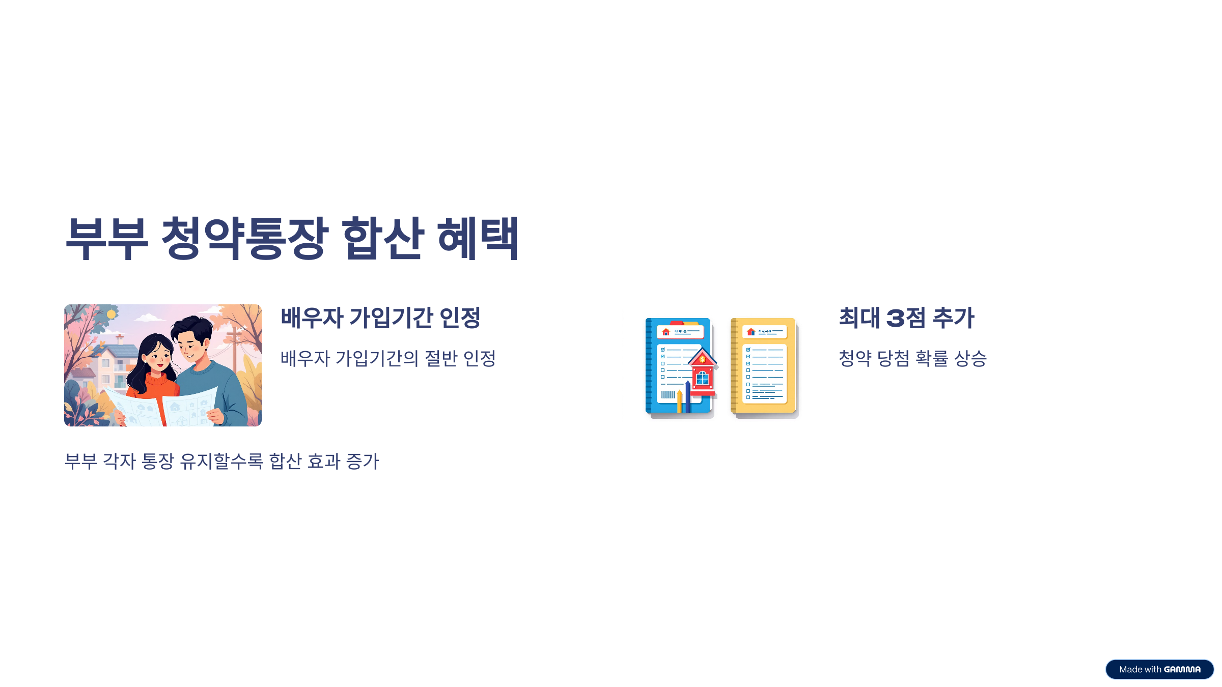 최근 개편으로 도입된 이 제도는 배우자의 청약통장 가입기간의 절반을 본인 가점에 추가로 인정해 줍니다. 최대 3점까지 보탤 수 있어 청약 당첨 확률에 상당한 차이를 만듭니다. 이를 활용하면 부부가 함께 장기적 청약 전략을 짜기 수월해집니다. 부부가 각자 통장을 유지하고 오래 가입해 둘수록 가점 합산 효과가 커집니다.