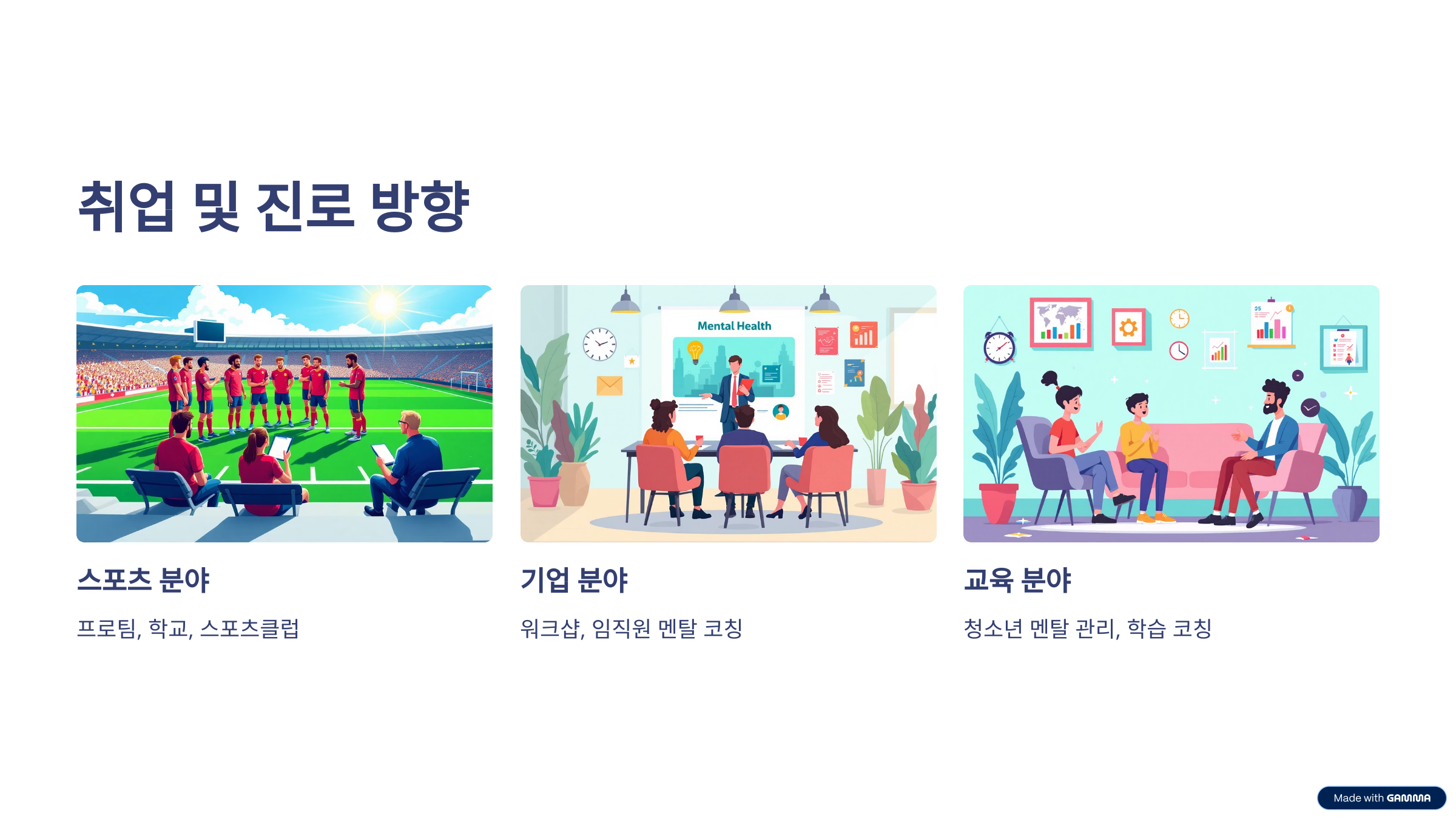 스포츠심리상담사는 단순한 심리상담을 넘어 선수들의 경기력 향상, 심리적 안정, 스트레스 관리 등 다양한 역할을 수행합니다. 경기 전 긴장감 조절, 슬럼프 극복, 목표 설정, 불안 해소, 집중력 향상 같은 심리 프로그램을 설계하고 제공합니다. 팀 단위로는 팀워크 향상, 집단 응집력 강화 등의 프로그램도 운영합니다. 특히 스포츠 특성상 성과와 직결되는 멘털 관리가 중요하기 때문에 그 수요가 점점 확대되고 있습니다. 최근에는 스포츠 분야 외에도 기업, 교육기관, 일반인 대상 멘털 코칭까지 확장되고 있어 활용 범위가 폭넓습니다.