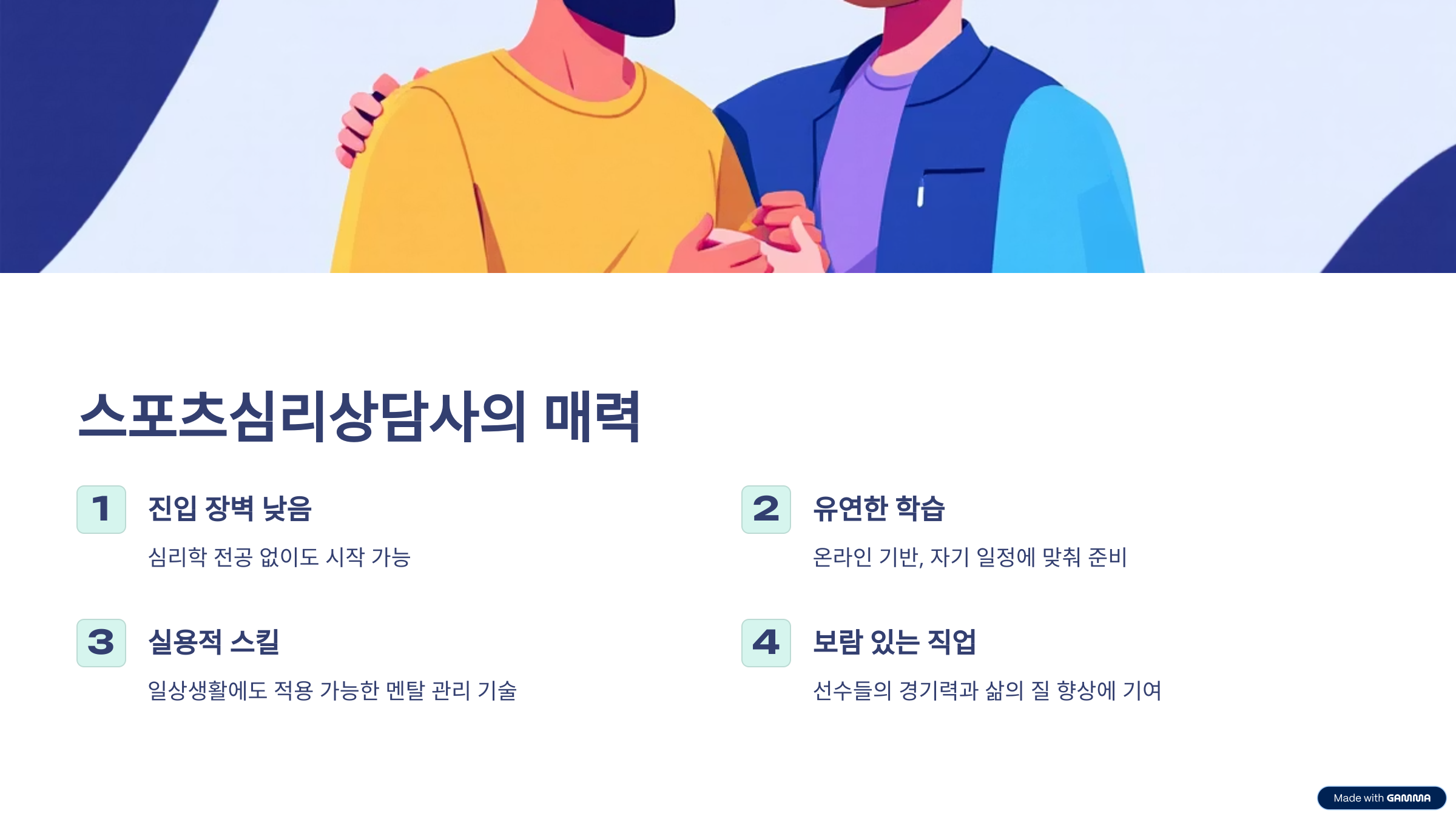 이 자격증의 가장 큰 매력은 심리학 전공이 아니더라도 시작할 수 있다는 점과 실무 중심의 실전 교육을 받을 수 있다는 것입니다. 온라인 강의 기반으로 자기 일정에 맞게 유연하게 준비할 수 있어 직장인이나 전공자 외 분야 종사자들도 많이 도전하고 있습니다. 또한 경기력 향상뿐 아니라 일상생활에서도 적용 가능한 멘털 관리 스킬을 배울 수 있어 개인적으로도 성장할 수 있습니다. 무엇보다 내가 가진 상담 능력이 선수들의 경기력과 삶의 질을 높여준다는 보람도 큰 직업입니다.
