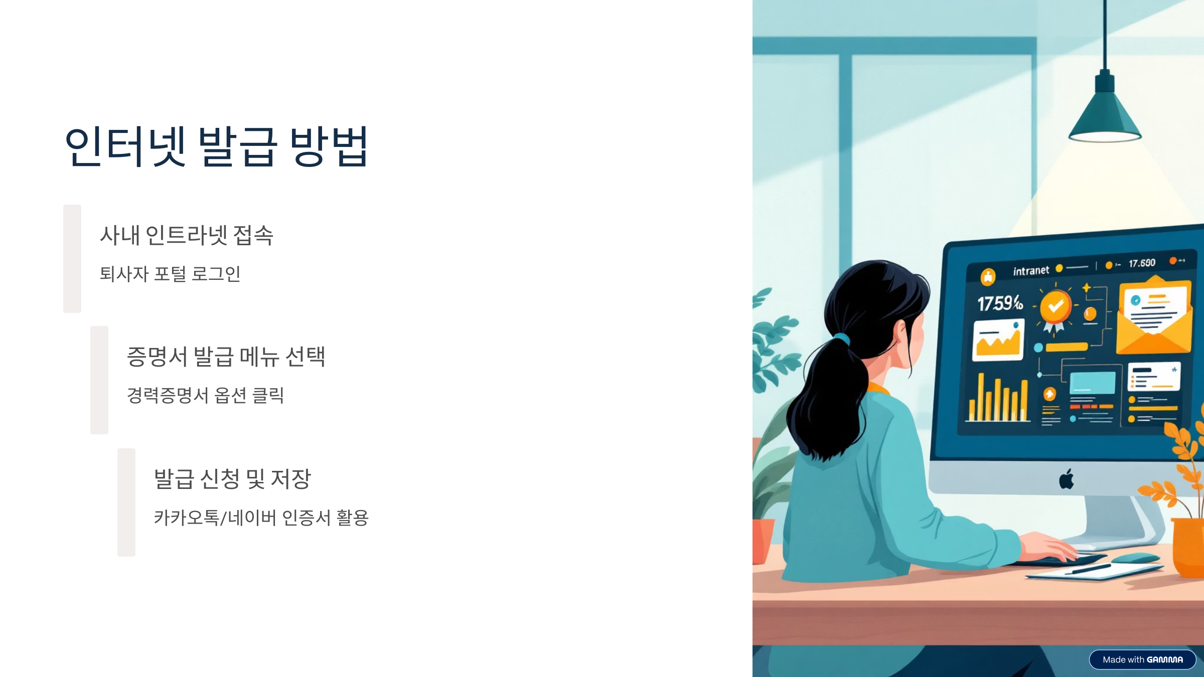 최근 대기업, 공기업, 중견기업 등 규모 있는 회사들은 대부분 전자 증명서 발급 시스템을 운영하고 있습니다. 사내 인트라넷이나 퇴사자 전용 포털 사이트에 접속해 간편하게 경력증명서 인터넷발급이 가능합니다. 로그인 후 증명서 발급 메뉴로 이동하여 경력증명서를 선택하고 신청하면 실시간으로 발급됩니다. 퇴사 후에도 일정 기간 동안 포털 접속 권한이 유지되는 경우가 많으므로 미리 확인해 두세요.