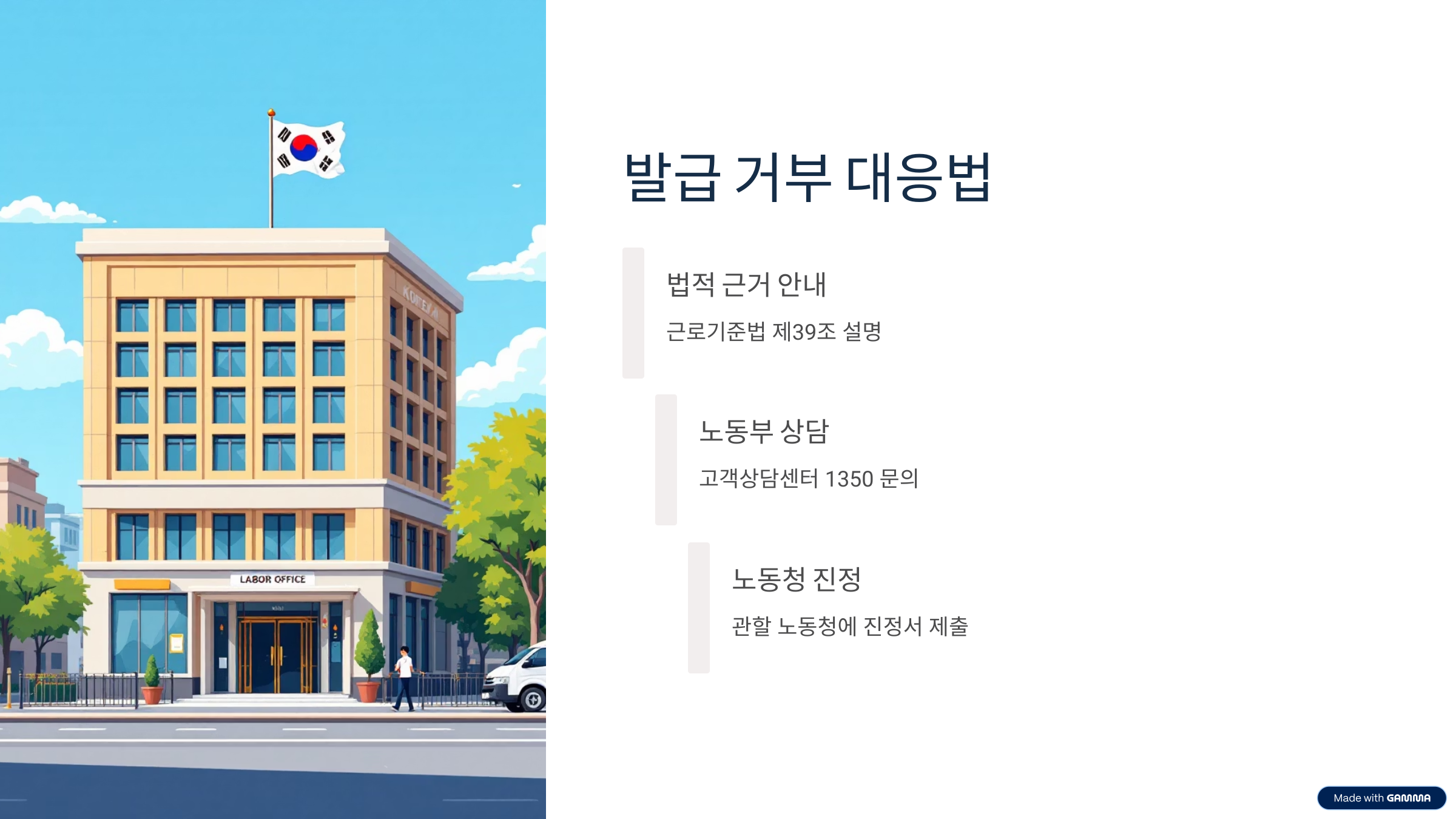 그래도 해결되지 않는다면 고용노동부 고객상담센터(국번 없이 1350)로 문의하거나 관할 노동청에 진정을 접수할 수 있습니다. 이런 경우 대부분 법적 절차를 안내받아 빠르게 해결되는 경우가 많습니다. 따라서 법적 권리를 적극 활용하세요.