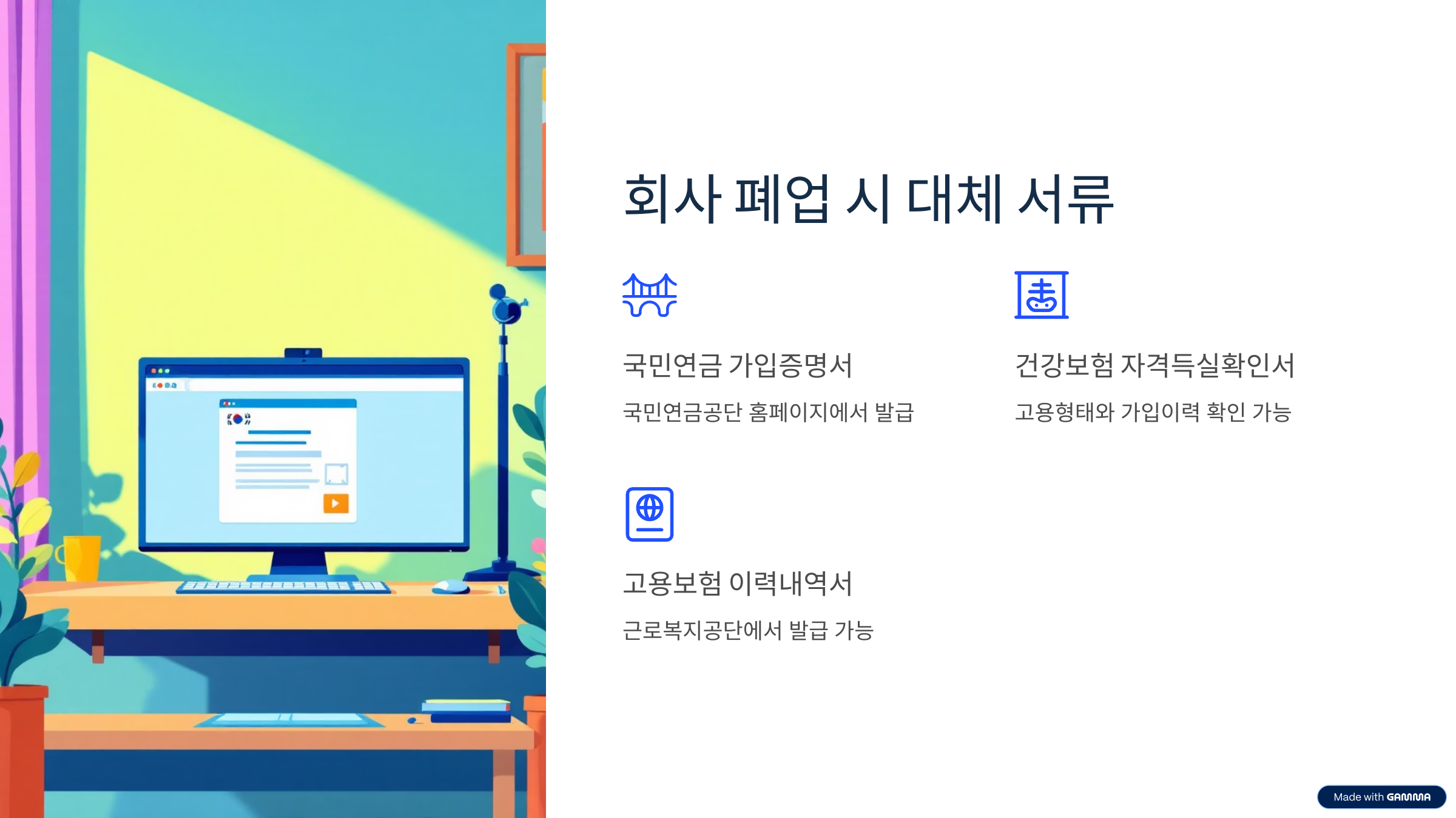 하지만 3년이 경과한 이후에도 많은 회사가 인사 DB를 장기간 보관하는 경우가 많습니다. 다만 이 경우는 처리 시간이 오래 걸리거나 일부 정보가 누락될 수 있으니 가능하면 퇴사 직후 미리 발급받아 보관하는 습관을 갖는 것이 가장 안전합니다. 회사가 폐업한 경우에는 국민연금, 건강보험, 고용보험 증명서로 대체가 가능합니다.
