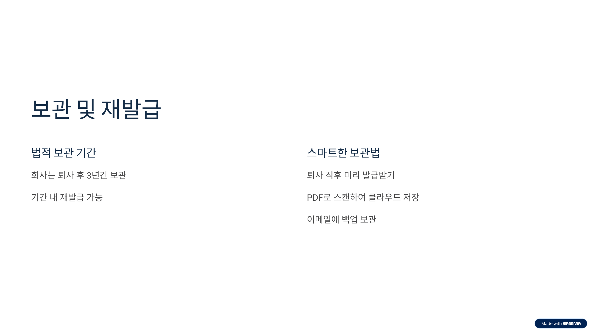 경력증명서 인터넷발급을 준비하는 가장 좋은 습관은 퇴사 전 미리 서류를 받아 안전하게 보관해 두는 것입니다. 대부분의 이직 준비자들이 퇴사 후에야 경력증명서 발급을 고민하지만, 퇴사 시점에서 바로 발급받아 PDF 파일로 스캔해 보관하면 향후 어떤 상황에도 즉시 활용할 수 있어요. 특히 회사가 폐업하거나 인사팀이 변경되어 연락이 어려워질 경우 큰 도움이 됩니다.
