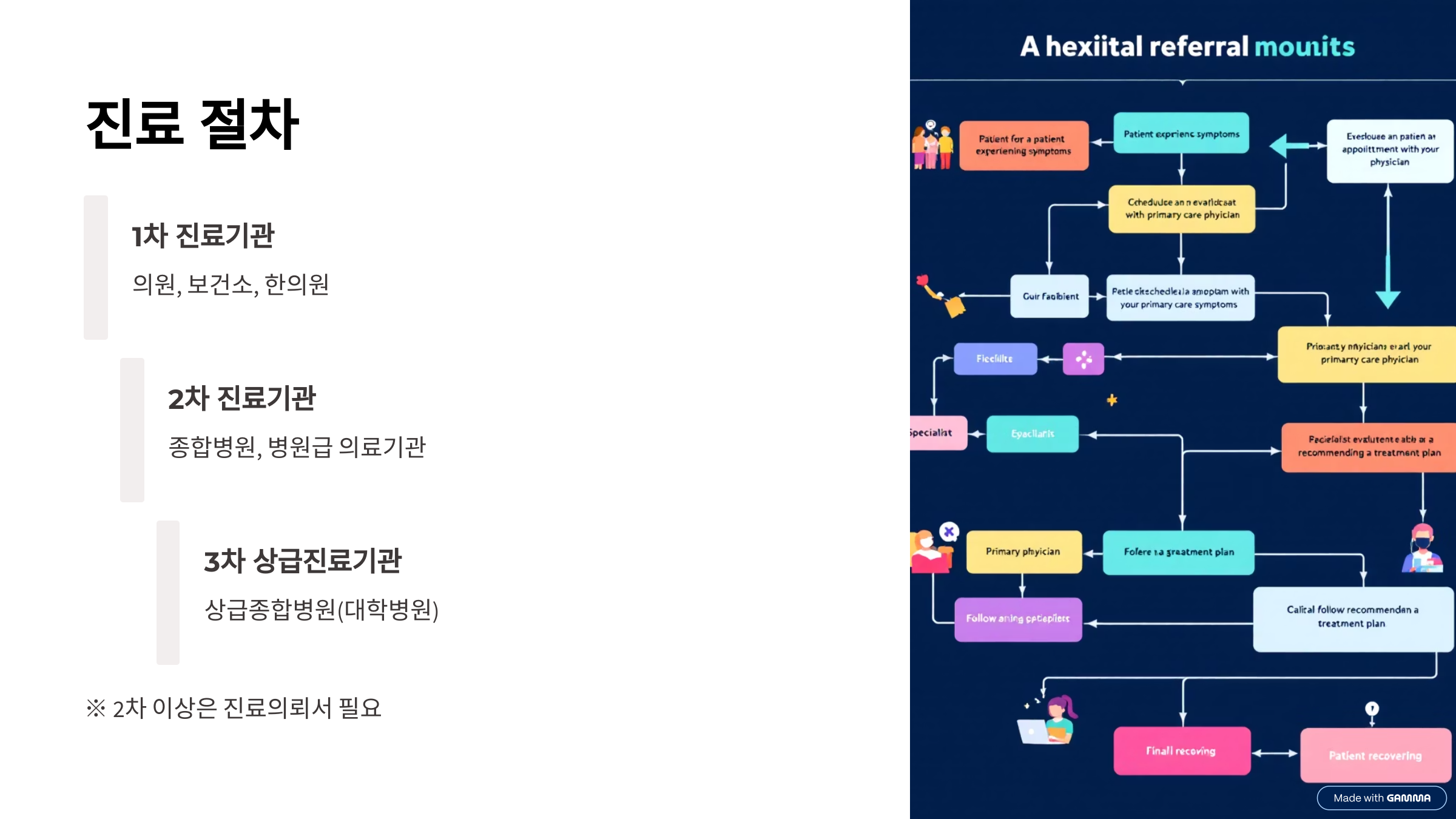 ※ 2차 이상으로 진료받으려면 1차 의료기관에서 발급하는 진료의뢰서가 필요합니다. 단, 응급·분만·중환자실은 예외 적용.