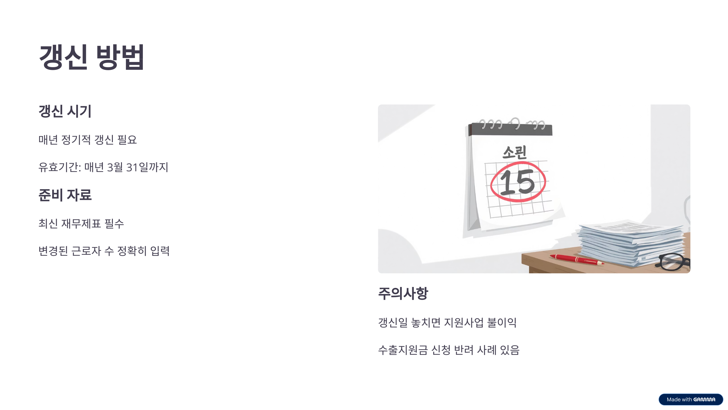 갱신 시 준비해야 할 자료는 신규 발급 때와 거의 동일하지만, 시스템에서 기존 입력자료가 자동으로 불러와지므로 비교적 수월합니다. 그러나 재무제표는 항상 최신 자료로 갱신 제출해야 하며, 신규 채용 등으로 변경된 상시근로자 수 입력도 정확히 해야 합니다.