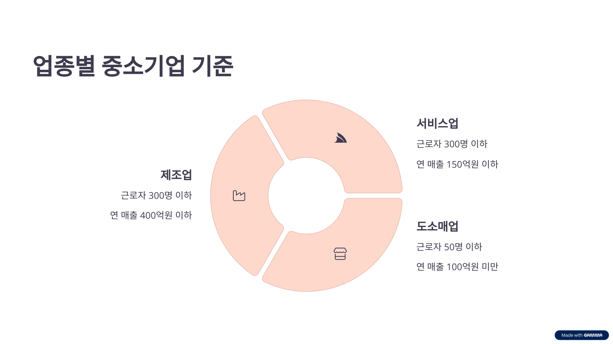 - 제조업: 상시 근로자 300명 이하, 연 매출 400억 원 이하