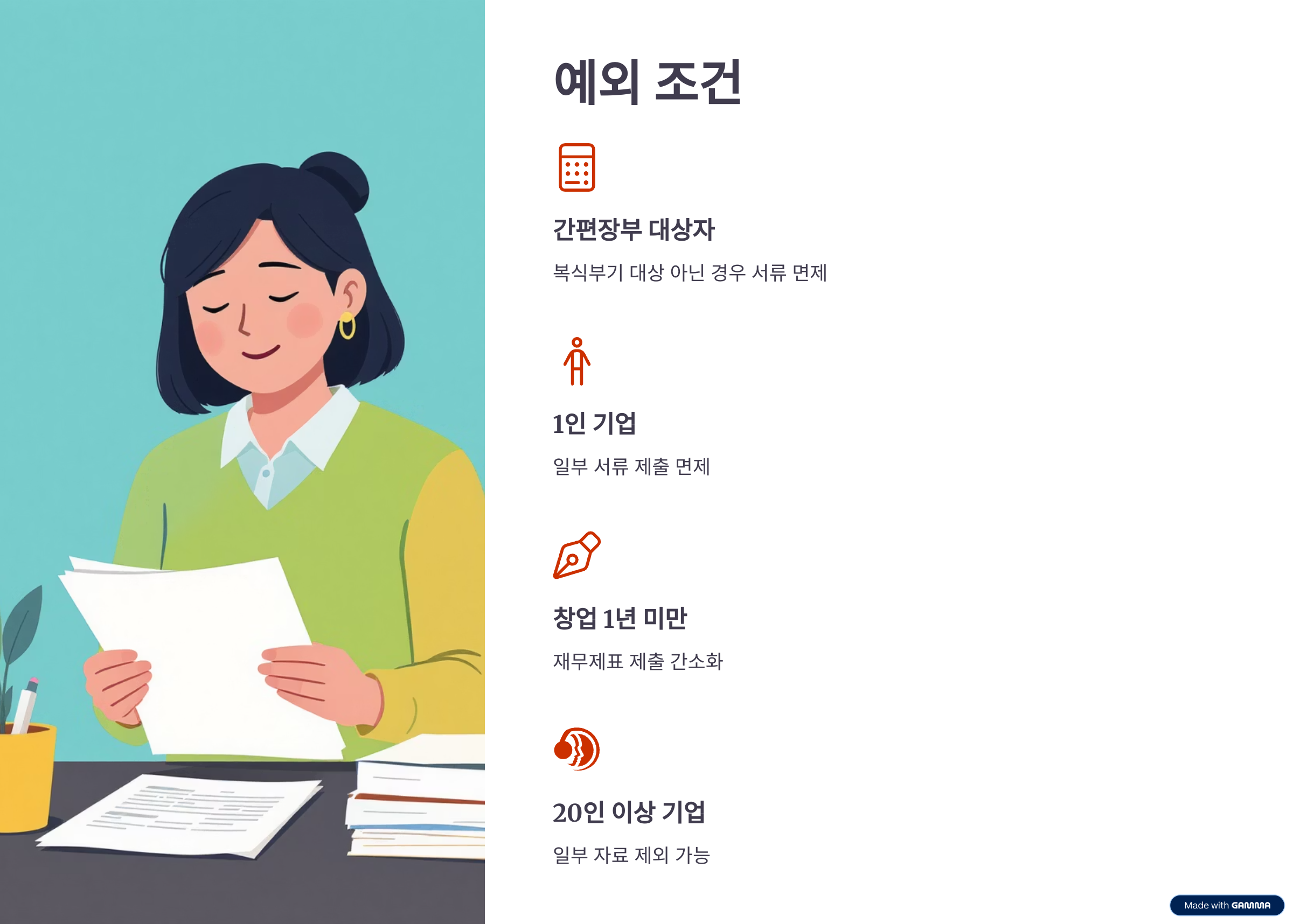 일부 기업은 자료 제출이 간소화되는 예외 대상에 해당될 수 있습니다. 예를 들어 다음 조건 중 하나에 해당되면 재무제표나 원천징수이행상황신고서 제출이 면제됩니다.