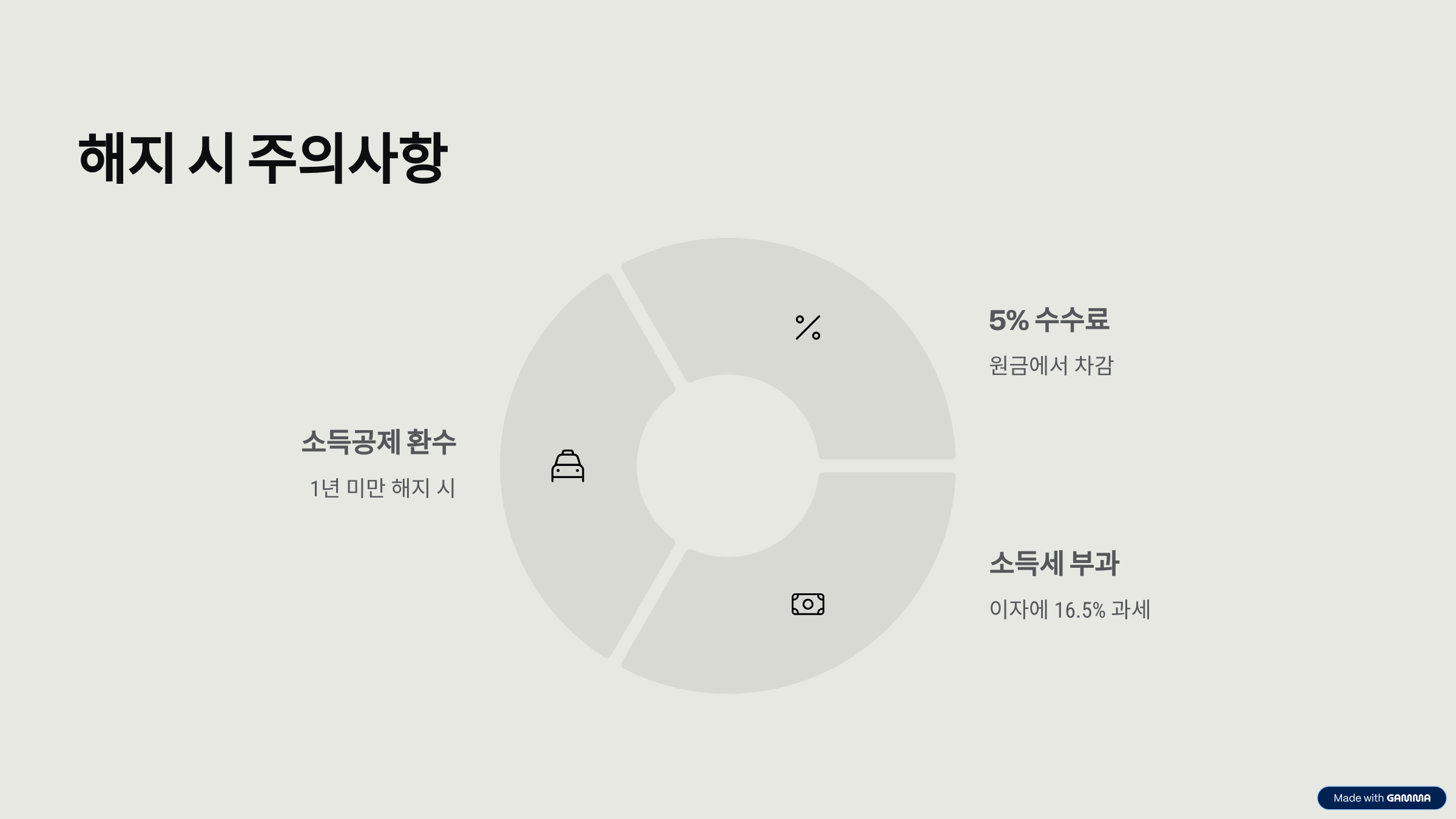 가장 조심해야 하는 것은 가입 후 1년 미만 해지 시 발생하는 3중 손실입니다.