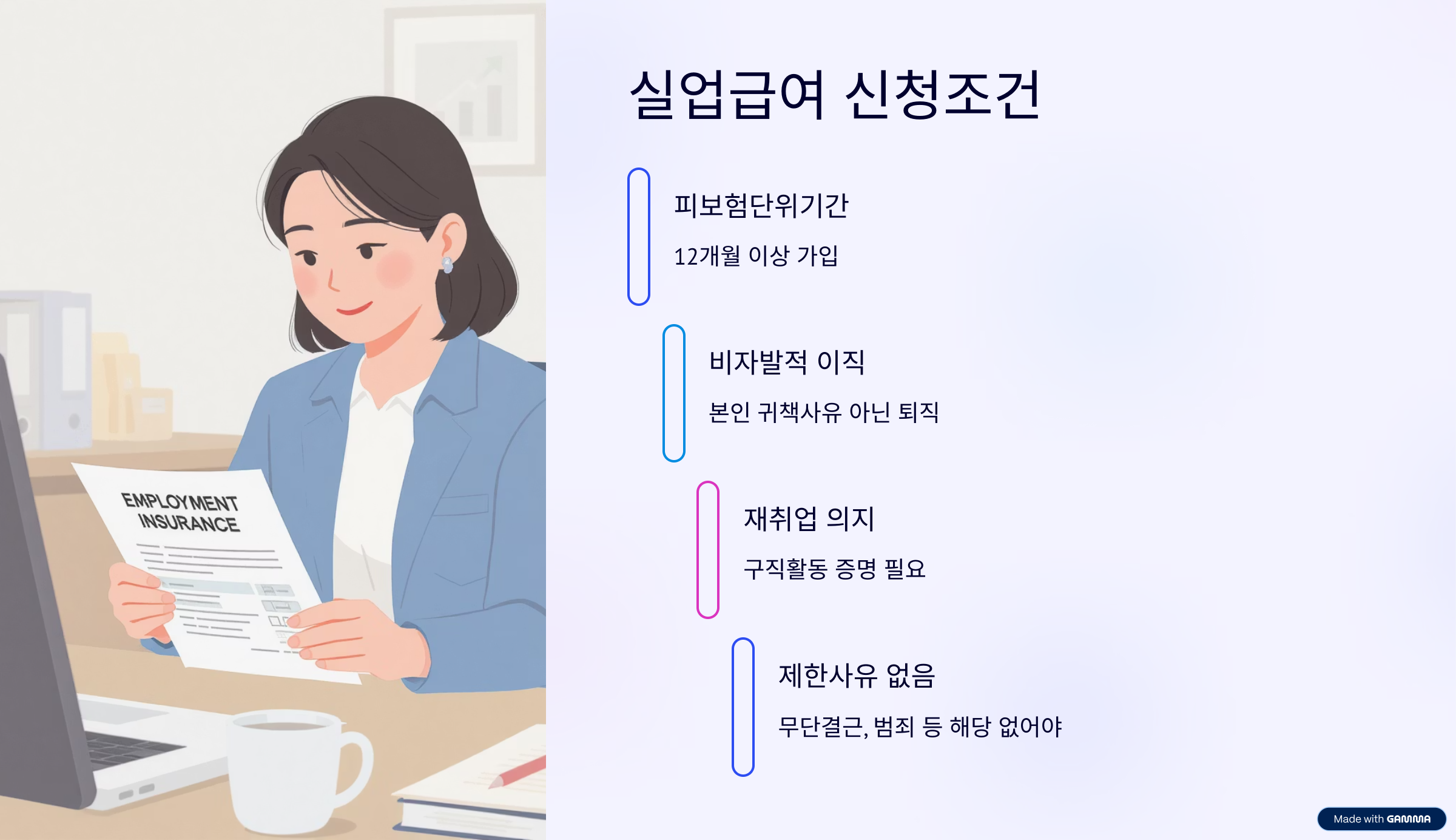 고용보험에 가입되어 실제로 일한 유급일 수가 통산 12개월 이상이어야 해요. 즉, 주 15시간 이상 일한 기간이 기준이 되며, 단순한 계약 기간이 아닌 실제 유급근무일을 기준으로 판단합니다. 계약이 반복된 경우에도 총유급일 수가 12개월을 넘으면 자격이 생겨요. - 비자발적 이직