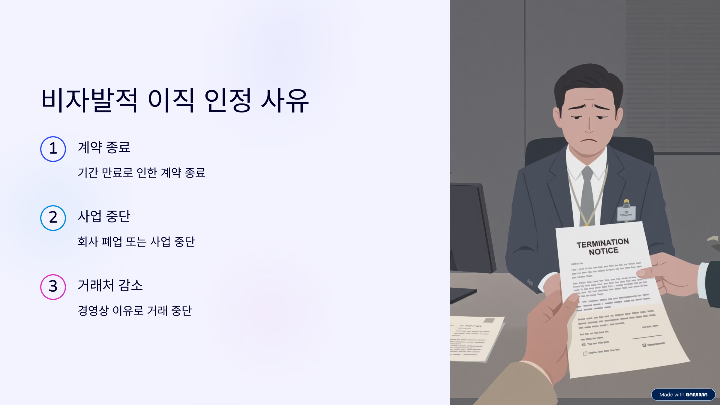 실업급여는 근로자가 본인의 의지로 퇴사한 경우에는 원칙적으로 받을 수 없어요. 하지만 계약 종료, 사업 중단, 거래처 감소, 경영상 해고 등 본인의 귀책사유가 아닌 경우는 비자발적 이직으로 인정되어 수급 자격이 생깁니다.