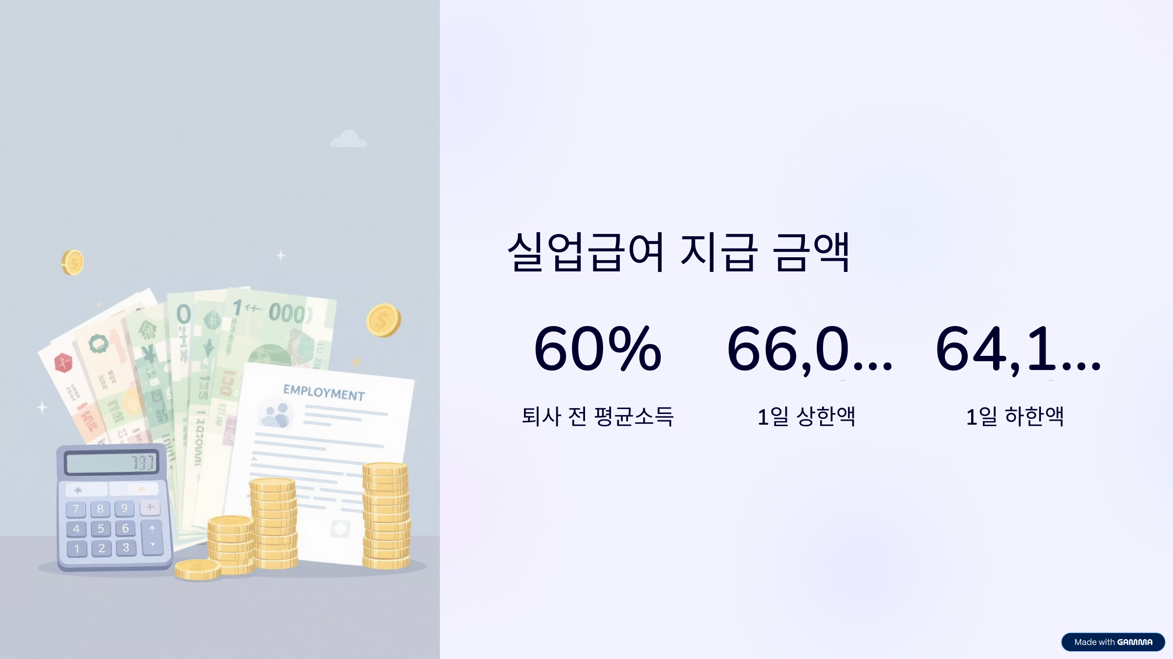 예를 들어 하루 평균 소득이 100,000원이면 실업급여는 60,000원입니다. 단, 1일 상한액은 66,000원이며, 하한액은 64,192원(2025년 기준)으로 설정되어 있어요.