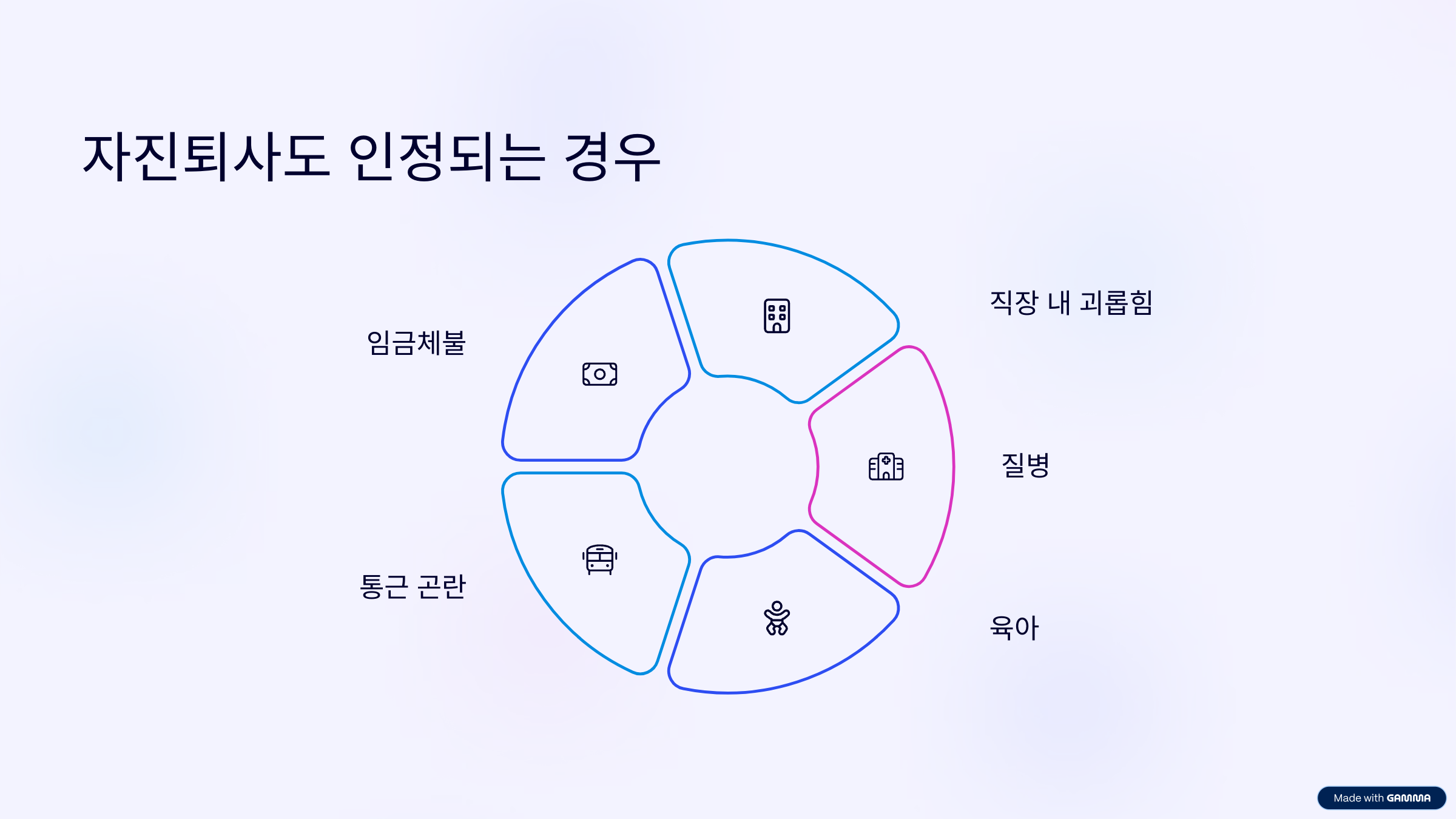 예외적으로 자진퇴사자라도 ‘임금체불’, ‘직장 내 괴롭힘’, ‘질병·육아·통근 곤란’ 등의 사유가 있다면 증빙자료 제출 시 실업급여 대상이 될 수 있어요. - 재취업 의지 및 구직활동