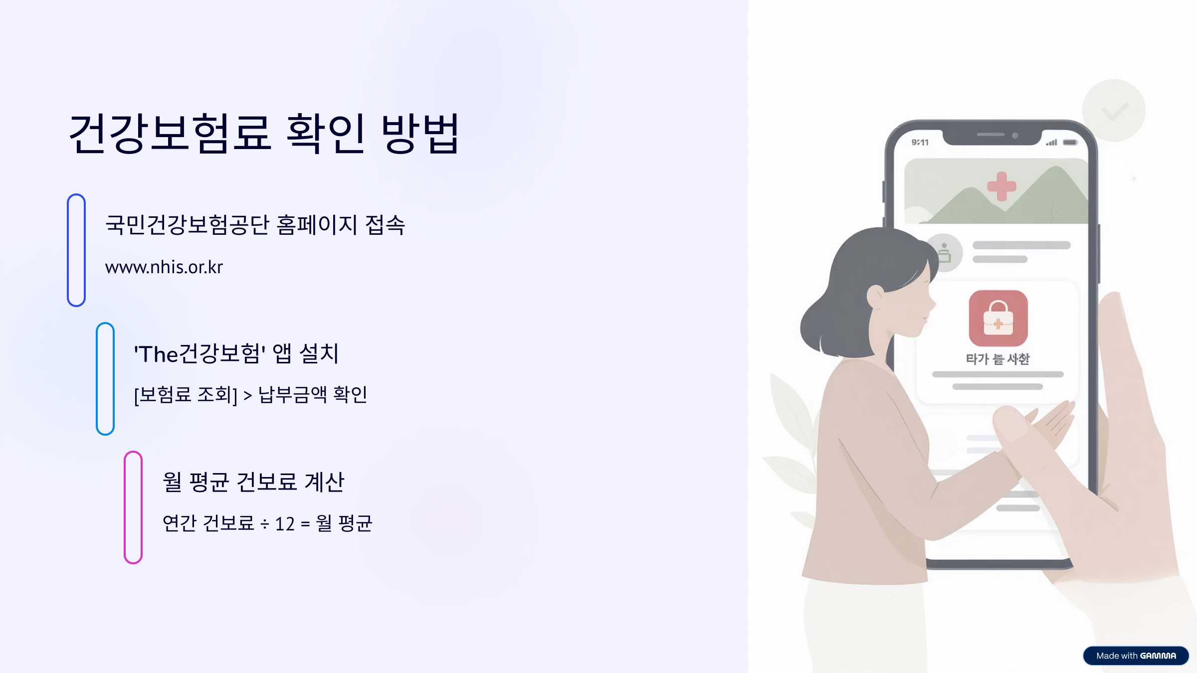 • 납부 내역 → 연간 총액 ÷ 12 = 월 평균 건보료 계산