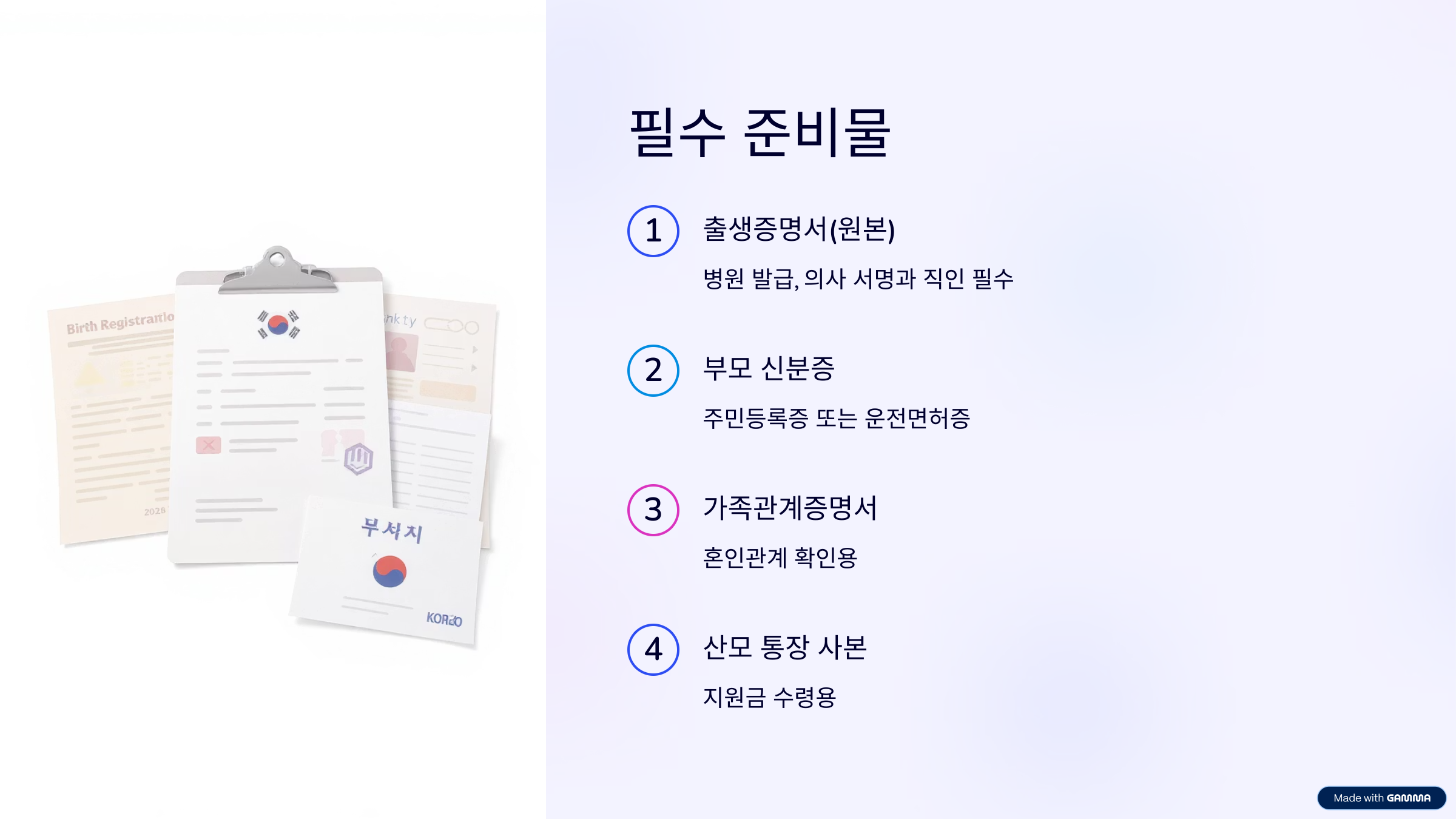 출생신고는 단순한 행정 절차가 아닙니다. 아기의 사회적 출발점이자, 다양한 출산 지원 제도를 시작하는 첫 관문입니다. 출생신고 준비물만 꼼꼼히 챙긴다면, 과태료 없이 빠르게 처리할 수 있고, 바우처나 현금 혜택까지 한 번에 받을 수 있어요. 막연한 걱정보다, 이 글에 나온 출생증명서, 출생신고서, 신분증, 통장 사본, 국민행복카드만 준비하세요.