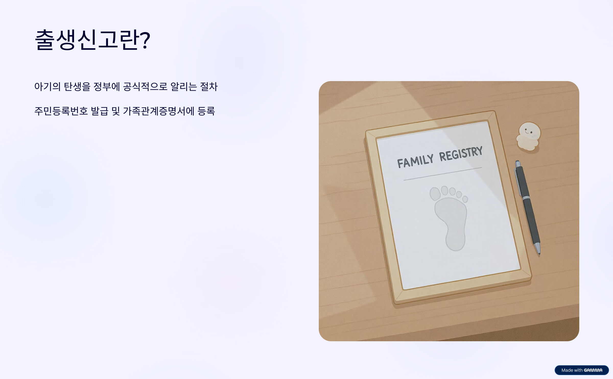 출생신고는 아기의 탄생 사실을 공식적으로 정부에 알리는 행정 절차입니다. 아기의 인적 사항이 주민등록상에 처음 등록되는 과정으로, 주민등록번호가 발급되고, 주민등본·가족관계증명서 등에 자녀 이름이 표시되기 시작합니다.