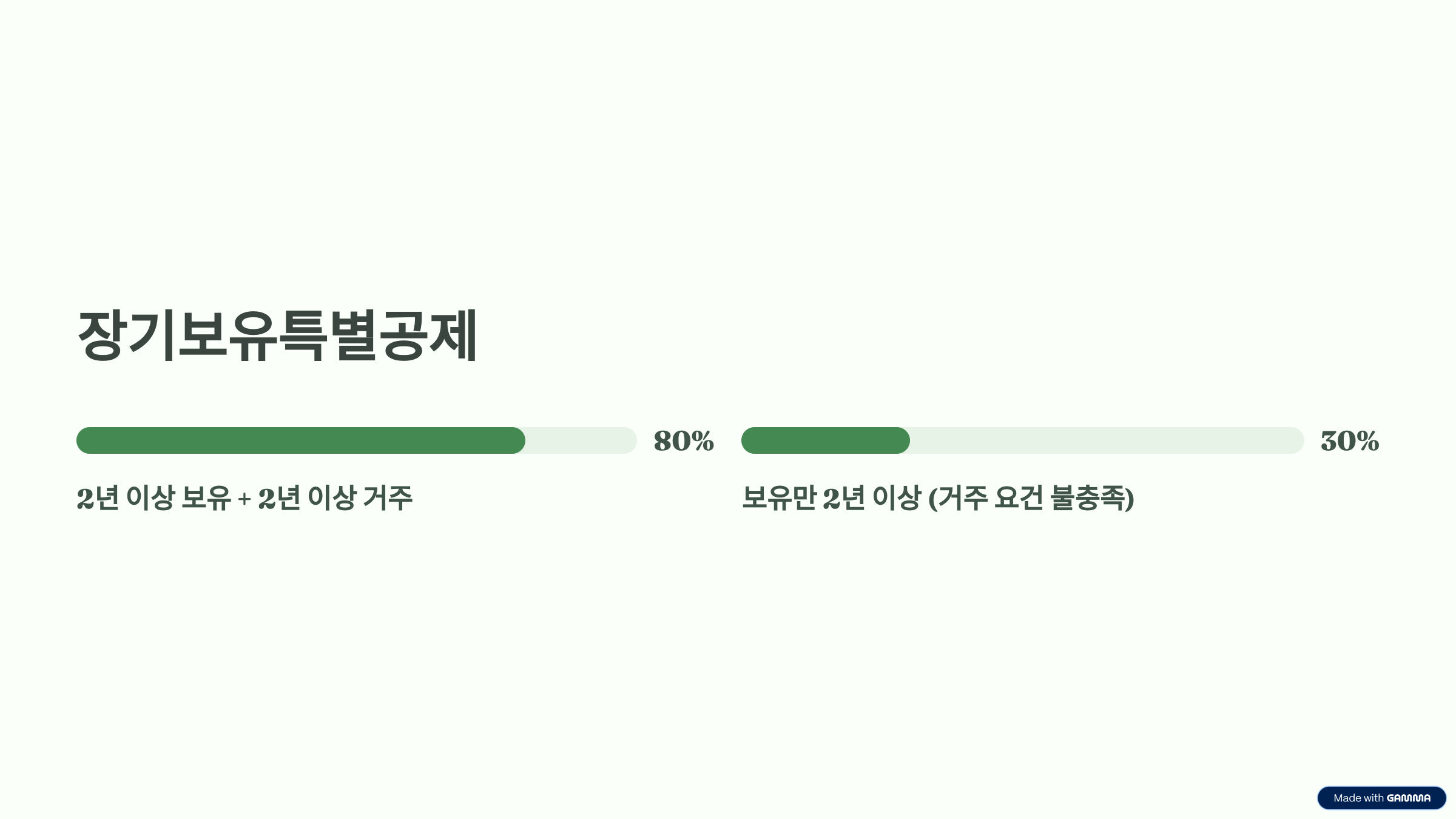 - 2년 이상 보유 + 2년 이상 거주: 최대 80% 공제