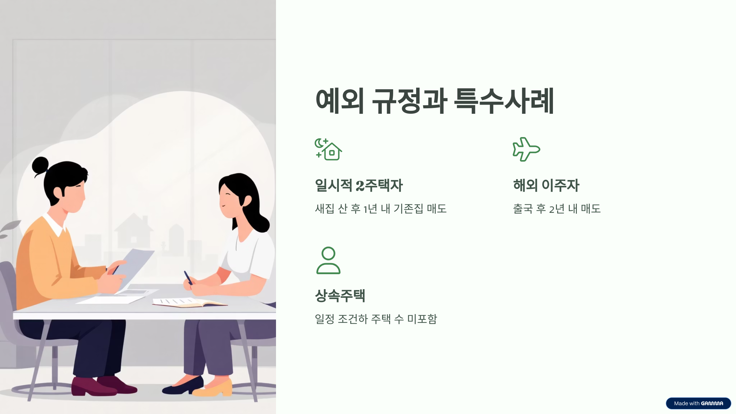 | ✔ 일시적 2주택자 | 새집을 산 후 기존 집을 1년 내 매도하면 비과세 인정 가능 (지역별로 2년 이내 유예 인정되는 경우도 있음) |