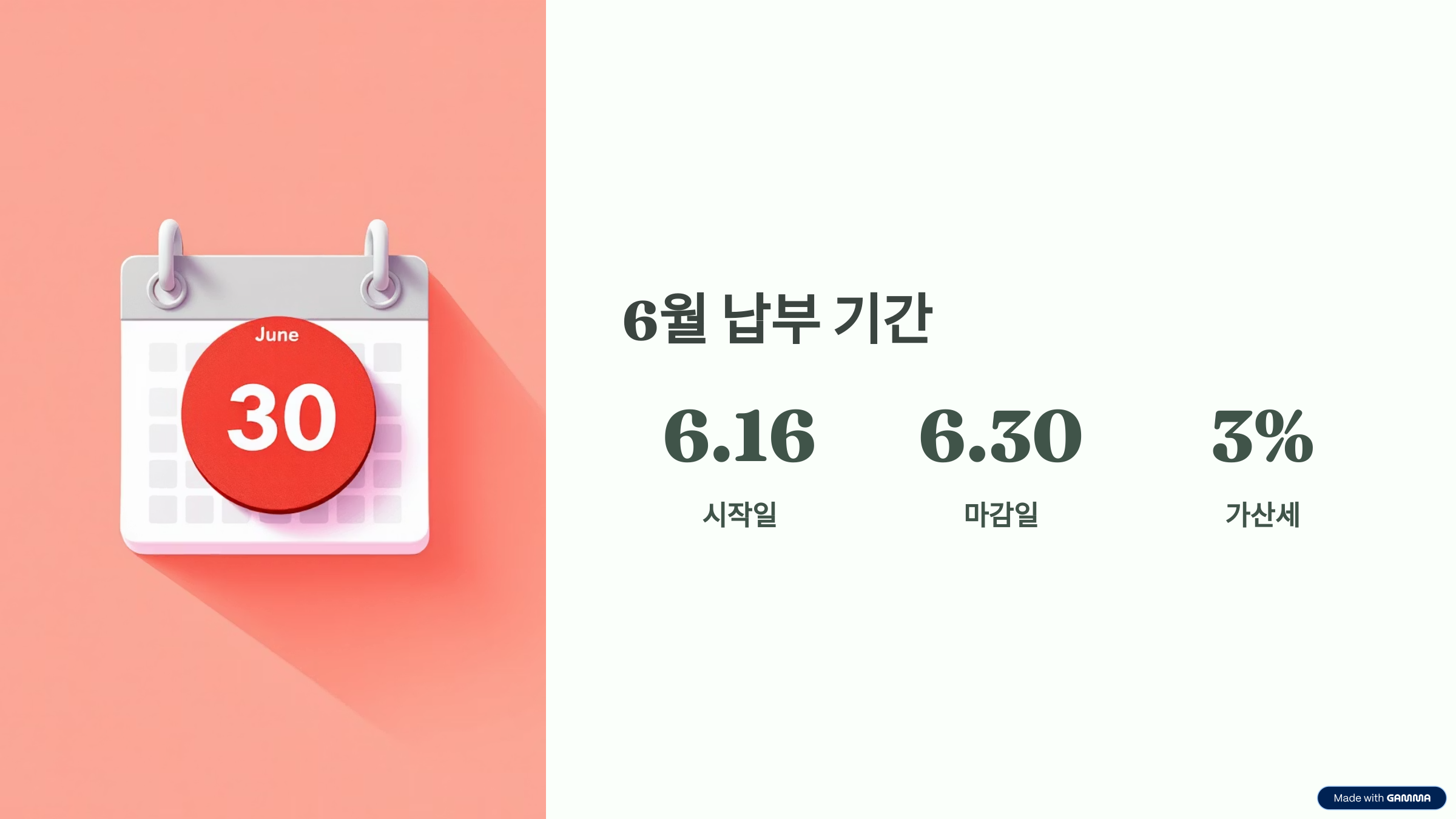 올해 기준으로 6월 자동차세 납부기간은 6월 16일부터 6월 30일까지입니다. 이때까지 납부하지 않으면 3%의 가산세가 부과될 수 있으므로 반드시 기한 내에 납부하셔야 해요.
