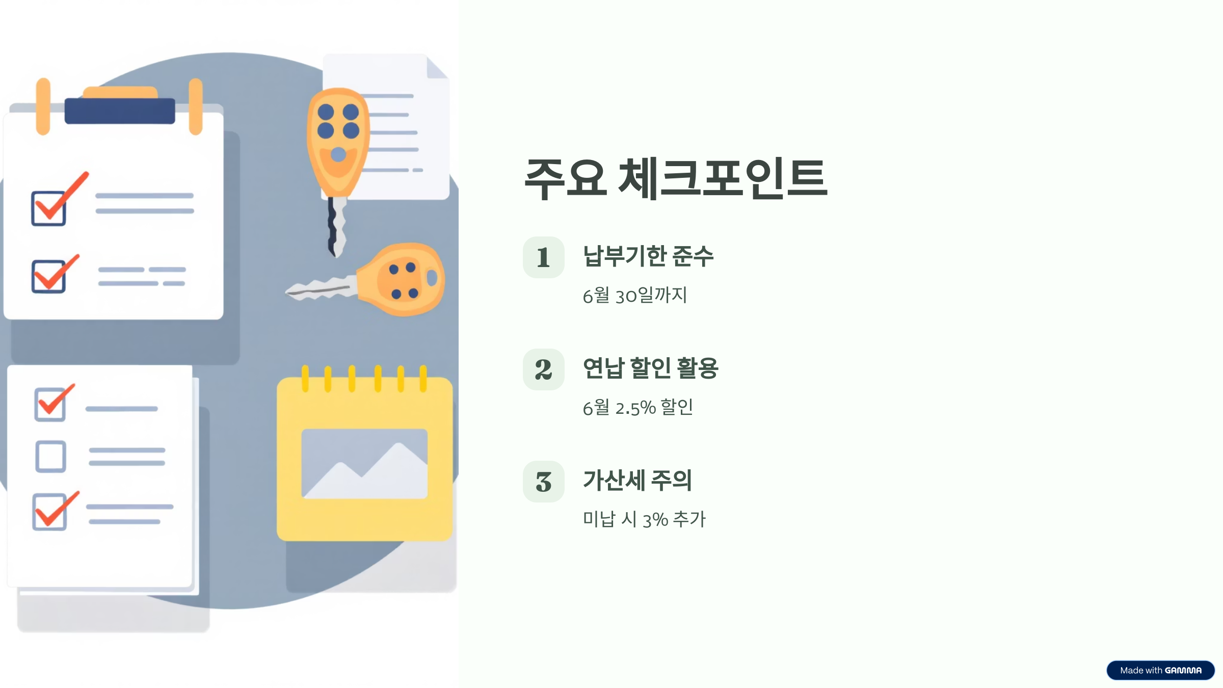 6월 연납 신청 시 할인율은 약 2.51%로, 연초보다는 낮지만 1월에 연납을 놓친 분들에겐 두 번째로 높은 할인 기회입니다. 특히 차량 유지비가 꾸준히 드는 만큼, 작은 할인이라도 누적하면 적지 않은 절약이 가능해요.