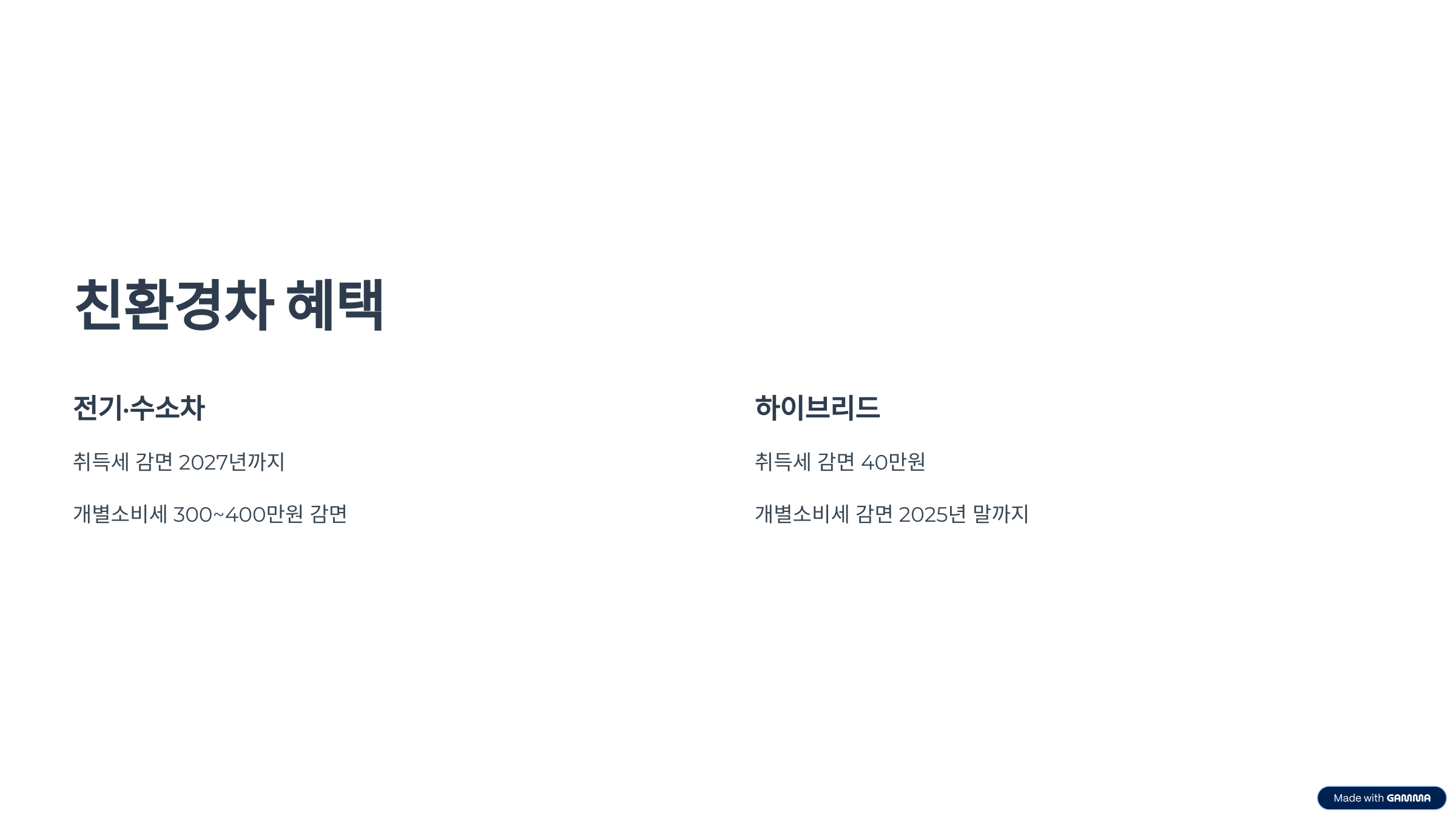 - 다만 개별소비세 감면은 △2025년 말까지, △하이브리드 혜택은 ∙2024년 말 종료 예정