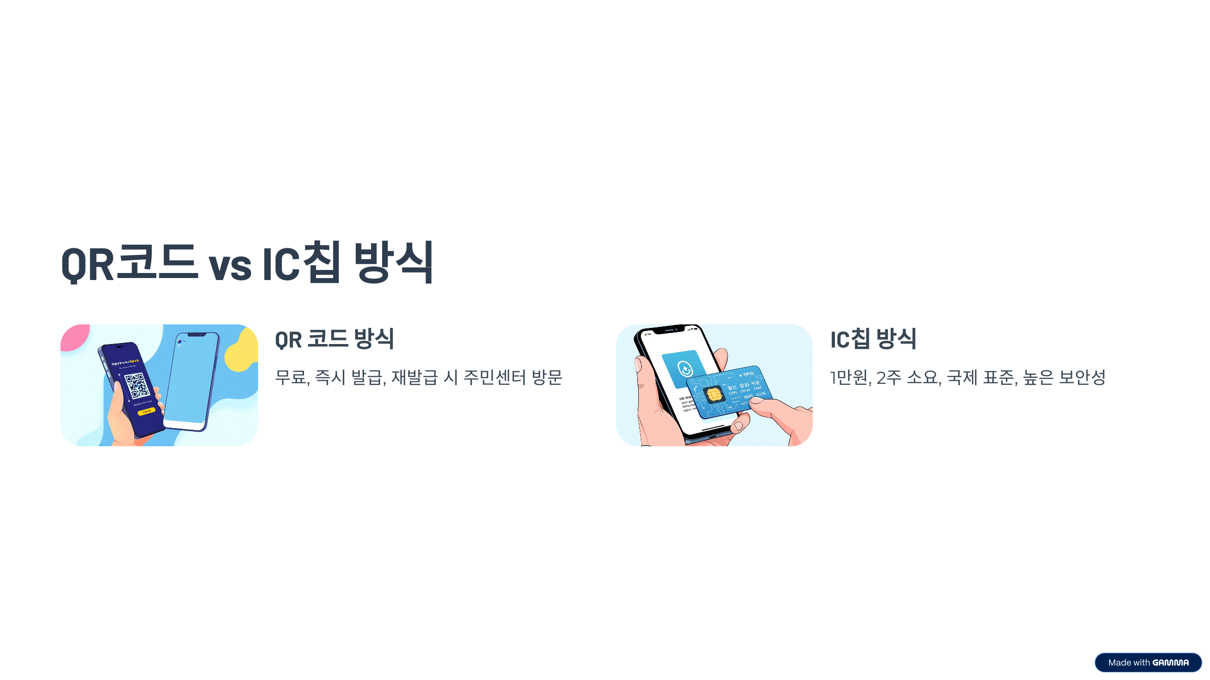 | 구분 | QR 코드 | IC칩 방식 |